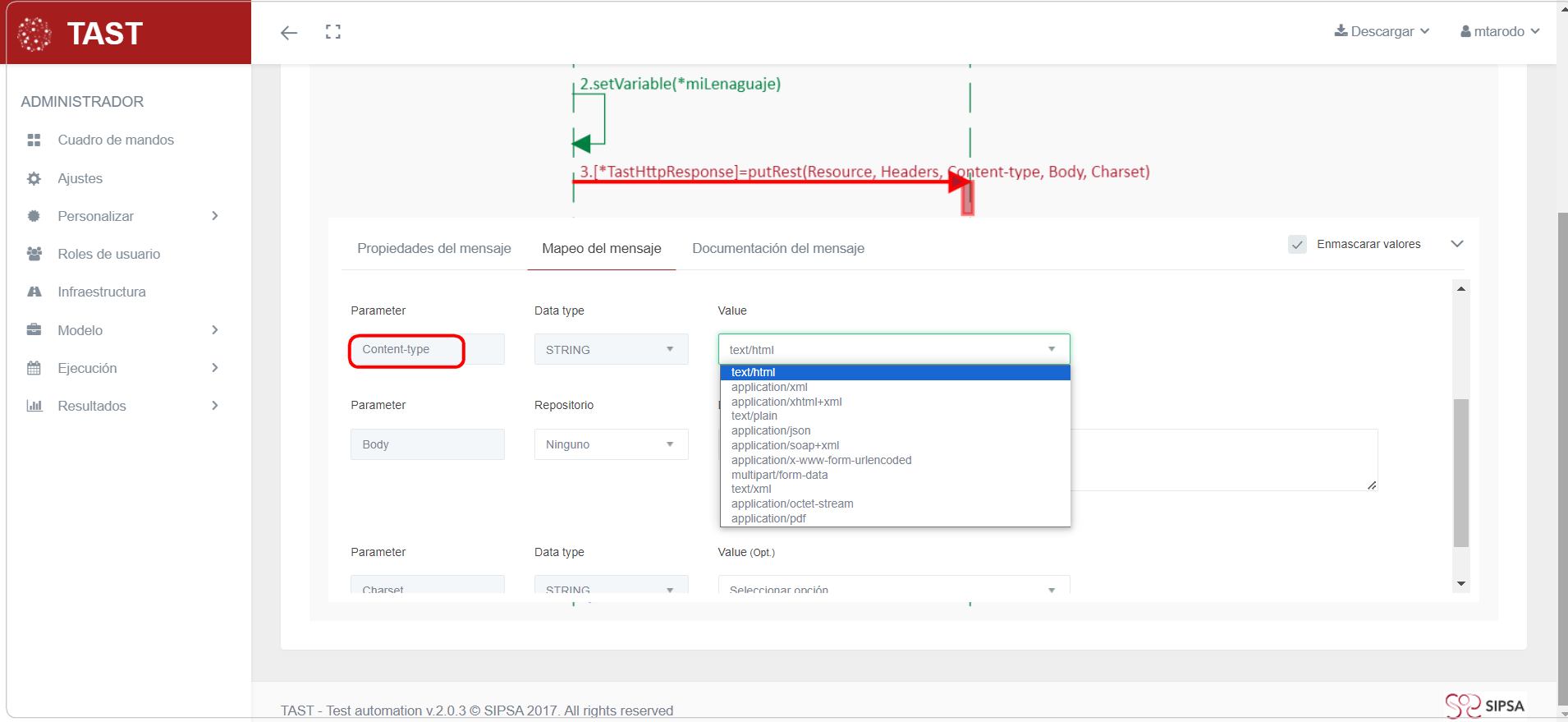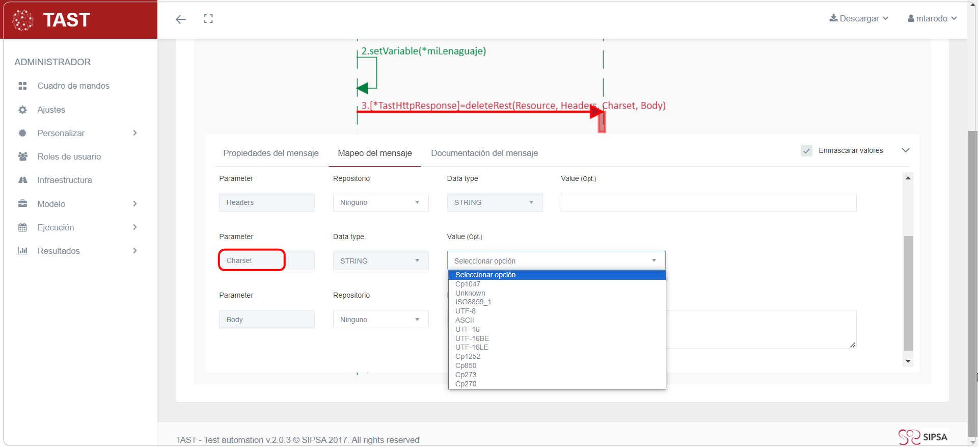 Resto de parámetros de las peticiones: dependiendo del tipo de petición, se habilitarán algunos parámetros de entrada que se mostrarán en la sección Parámetros, introducidos en Mensaje / Petición.