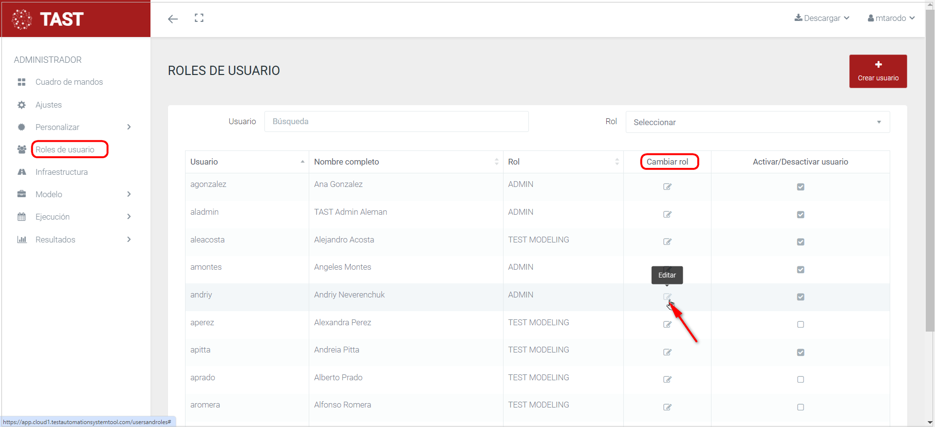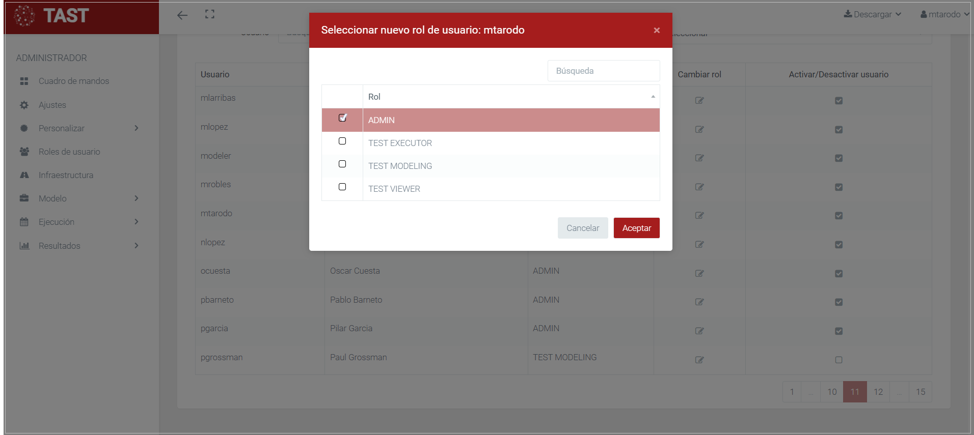 Esta opción de la herramienta TAST permite al administrador cambiar el rol asignado a un usuario en el proyecto.