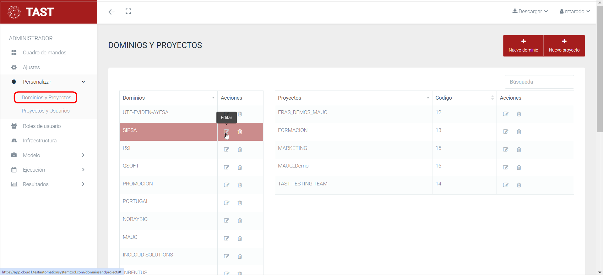 Esta opción de la herramienta TAST permite al administrador editar un dominio.