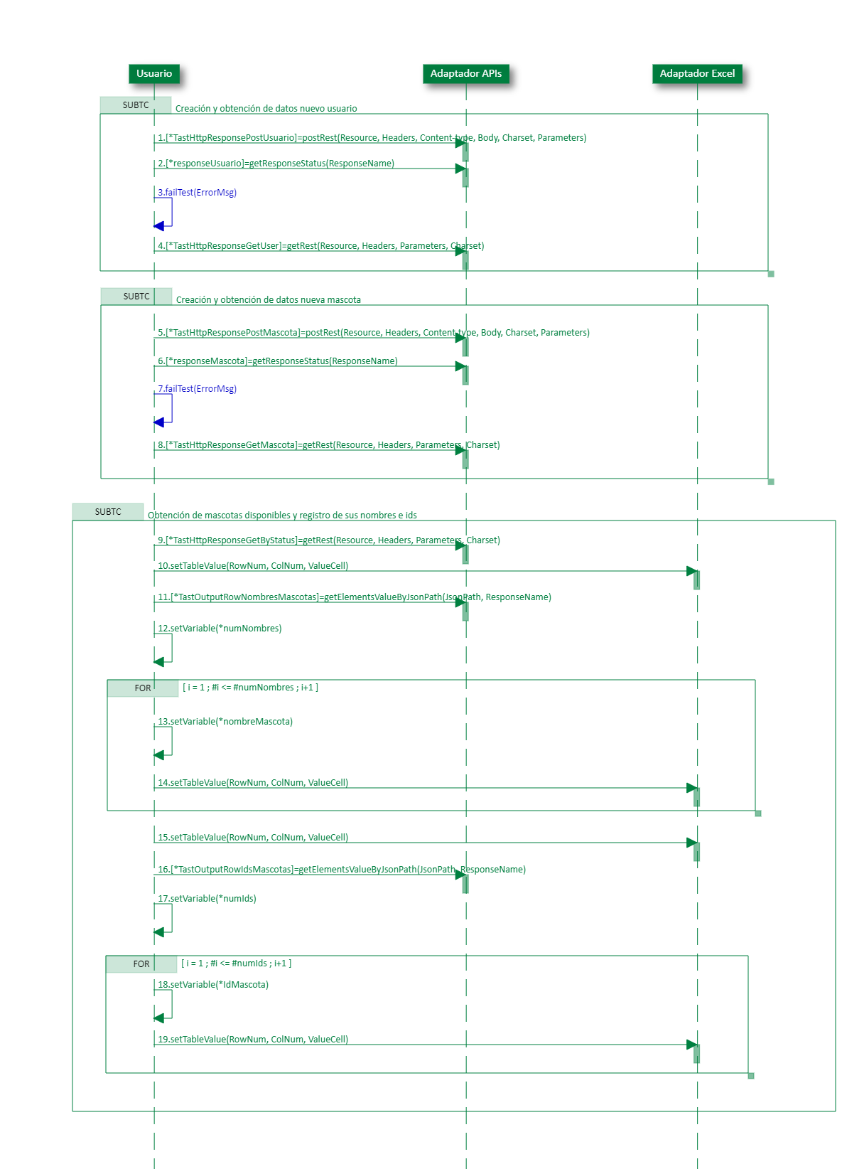 En este diagrama (Diagrama 13298) se han creado tres Subtestcases. La primera para crear y obtener datos del usuario creado. La segunda para crear y obtener datos de la nueva mascota y la tercera para obtener los nombres de las mascotas y sus correspondientes id. Obtendremos un resultado de cada subtestcase aparte del resultado final.