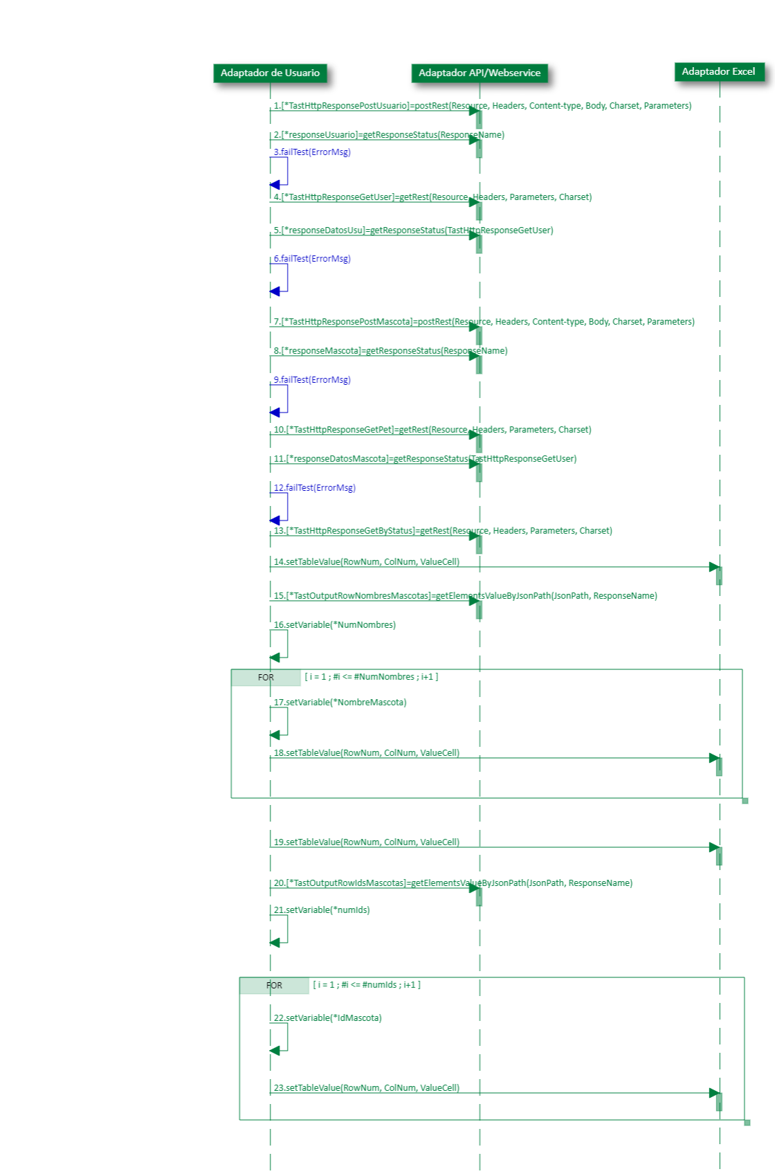 Hemos diseñado estos dos casos de prueba utilizando tres Adaptadores: el Adaptador de Objetos de Usuario, el Adaptador Webservice y el Adaptador de Excel.