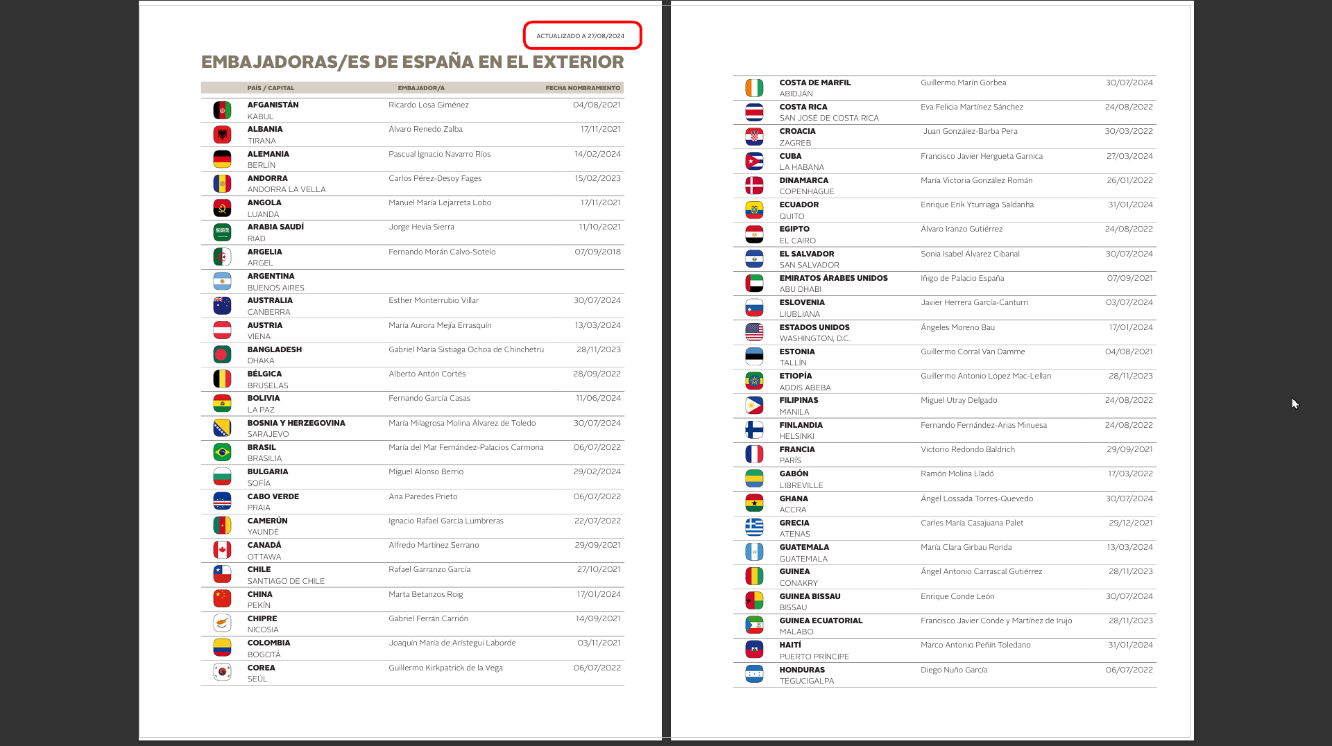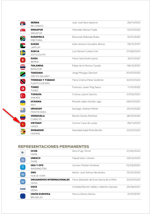 - Buscará el nombre del representante de este país: Carmen Cano de Lasala y la fecha de nombramiento: 28/11/2023.