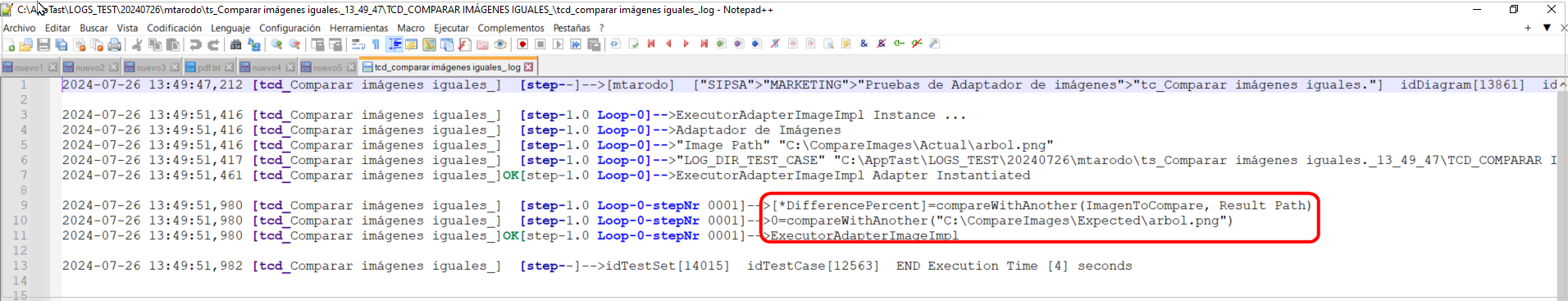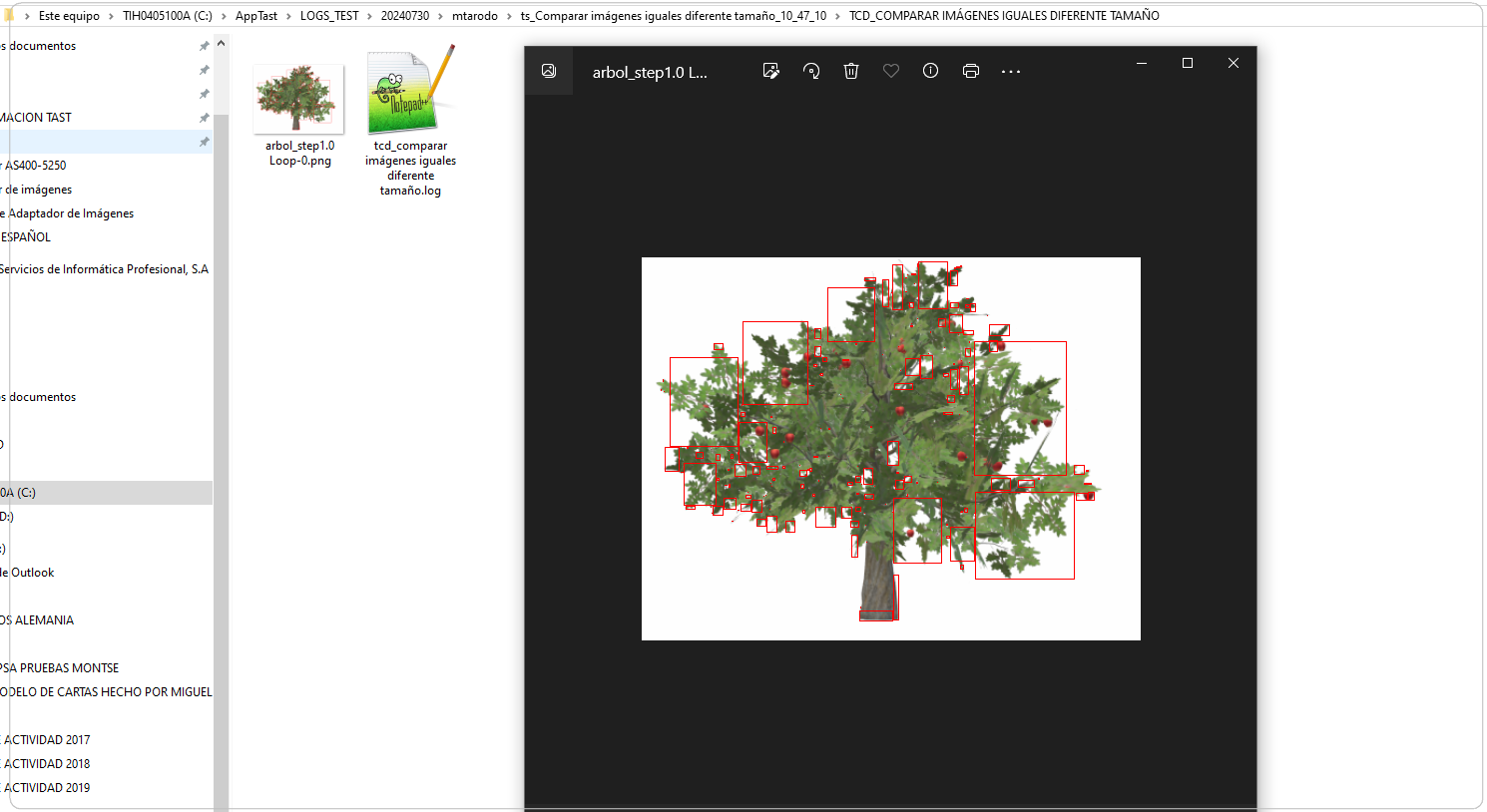 Como son exactamente la misma imagen, si a continuación abrimos la carpeta con los logs nos dice que el porcentaje de la diferencia es cero: