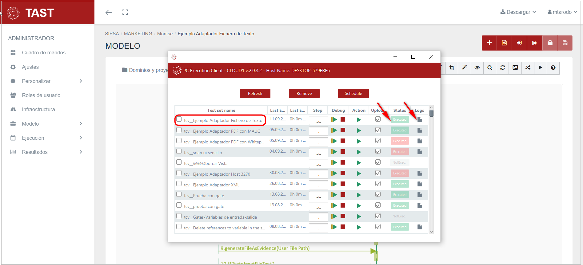 Para ejecutar este caso de prueba, abrimos el Cliente de TAST, lo buscamos y lanzamos la ejecución. Cuando terminamos de ejecutar este caso de prueba, vemos si se ha ejecutado correctamente. Nos aparecerá la casilla de Status marcada en verde. A continuación hacemos clic en el icono de la derecha (marcado con una flecha roja) si queremos ver con detalle la ejecución.