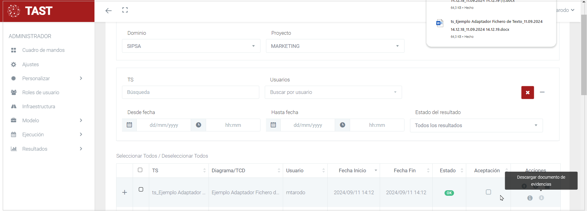 TAST nos devuelve un documento Word, detallando la fecha de ejecución, los pasos que hemos dado, los resultados obtenidos de cada paso, los enlaces al diagrama y al conjunto de pruebas.