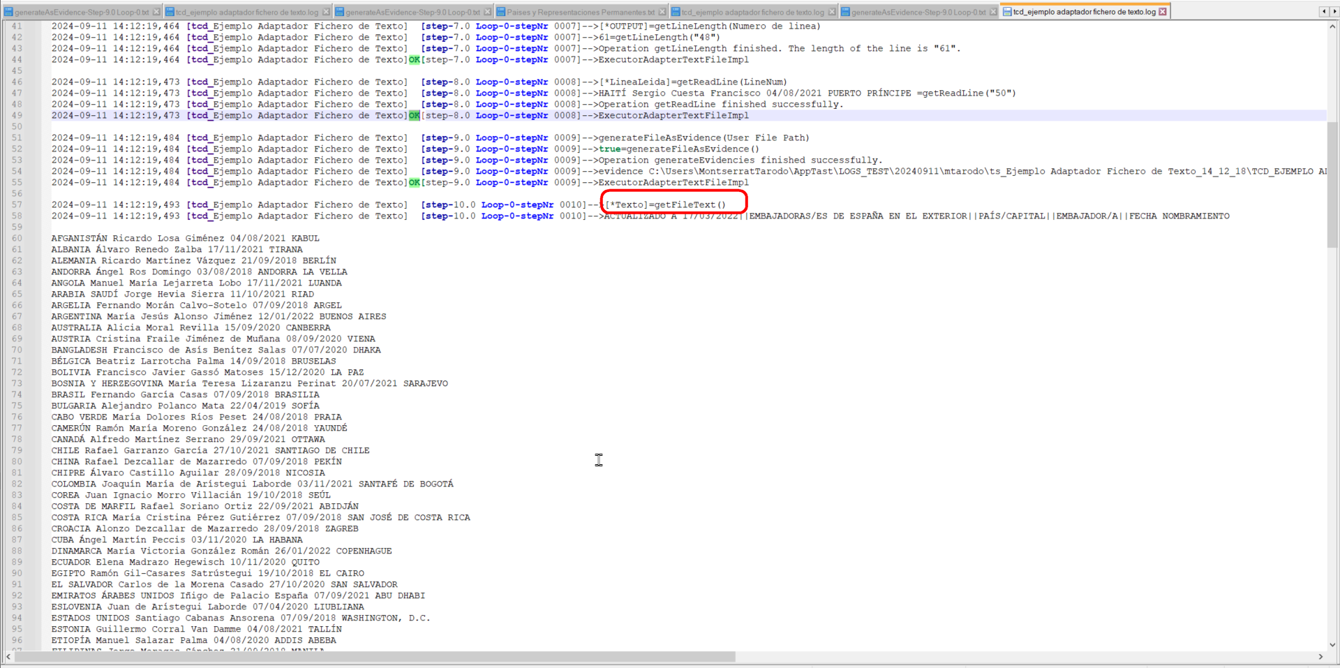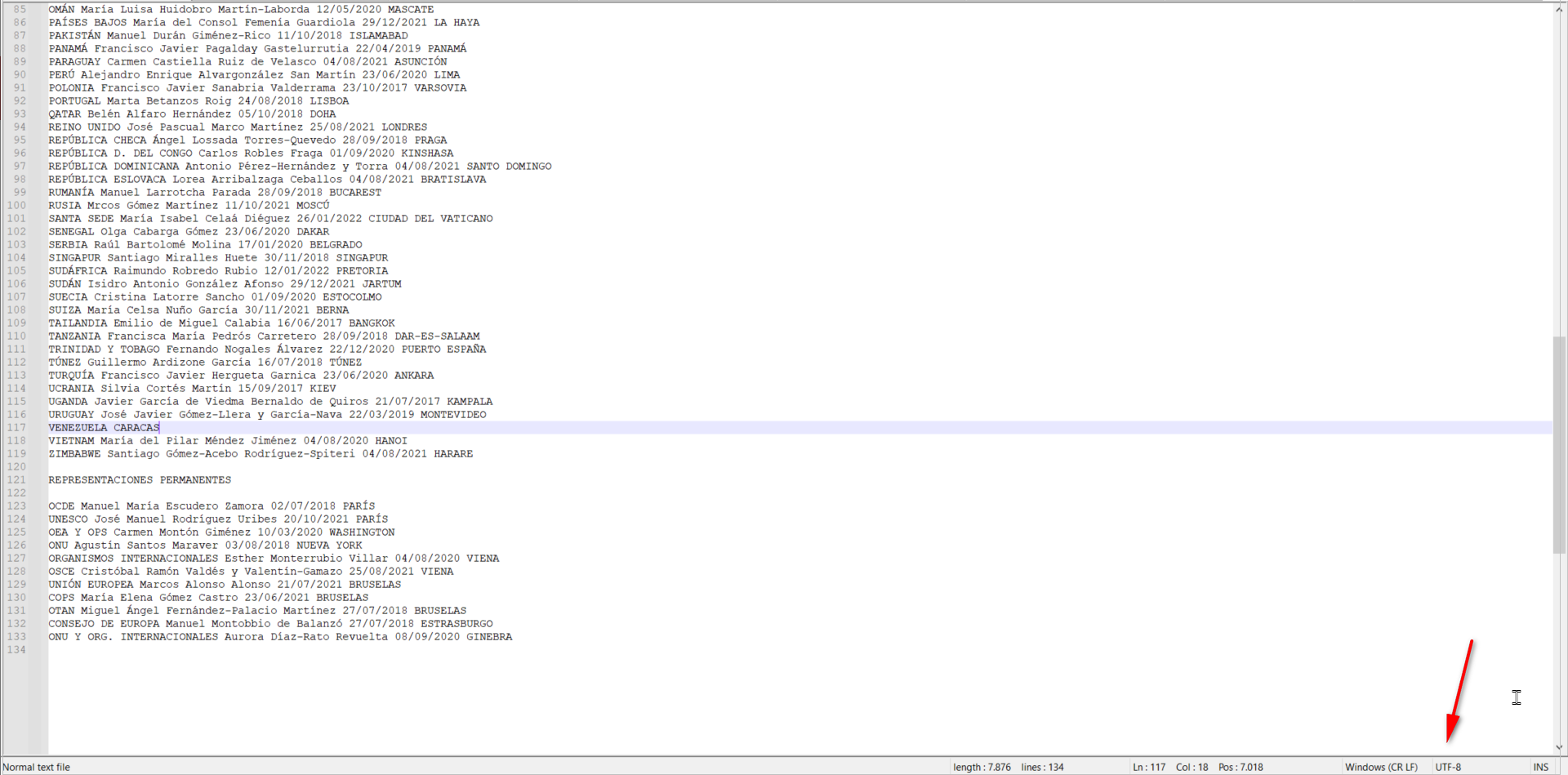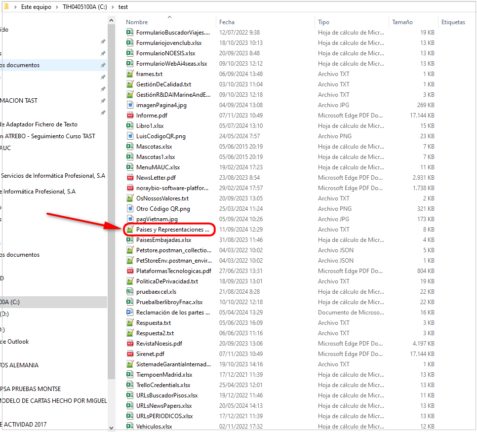 En este caso de prueba partimos de un fichero .txt que hemos creado anteriormente. Lo guardamos en el directorio C:\test con el nombre que le hemos dado, en este caso C:\test\Paises y Representaciones Permanentes.txt