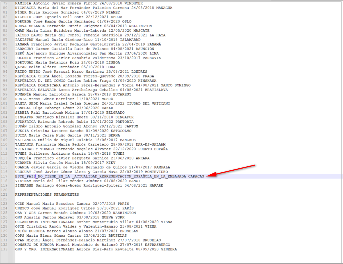 Reemplace un Texto por otro. Ha cambiado el texto (VENEZUELA) por ESTE_PAIS_NO_TIENE_EN_LA _ACTUALIDAD_REPRESENTACION_ESPAÑOLA_EN_LA_EMBAJADA.