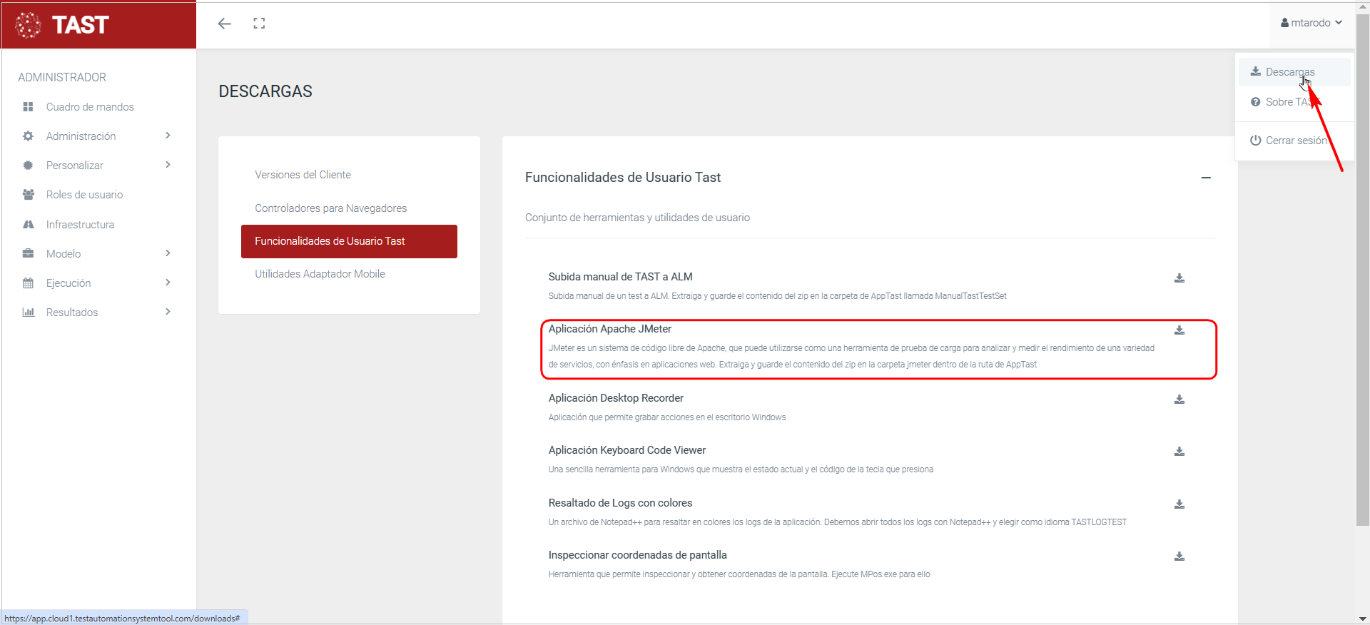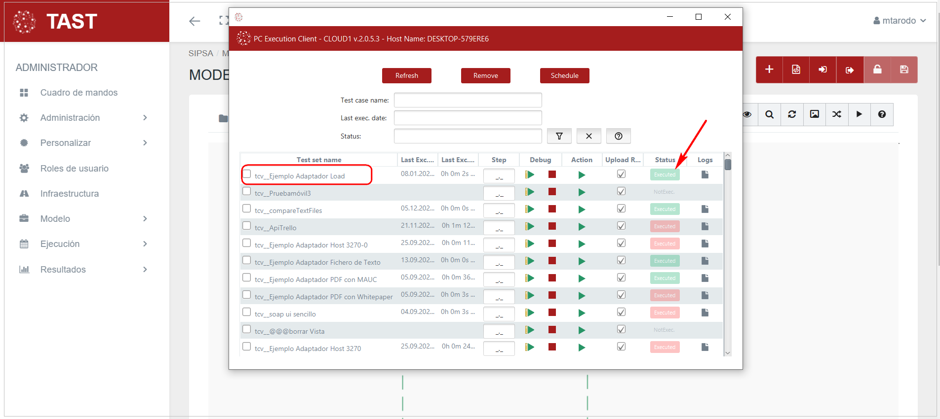 Para ejecutar este caso de prueba, abrimos el Cliente de TAST, buscamos el caso de prueba y lanzamos la ejecución. Comprobamos si se ha realizado correctamente, si aparece marcada en verde la casilla de Status.