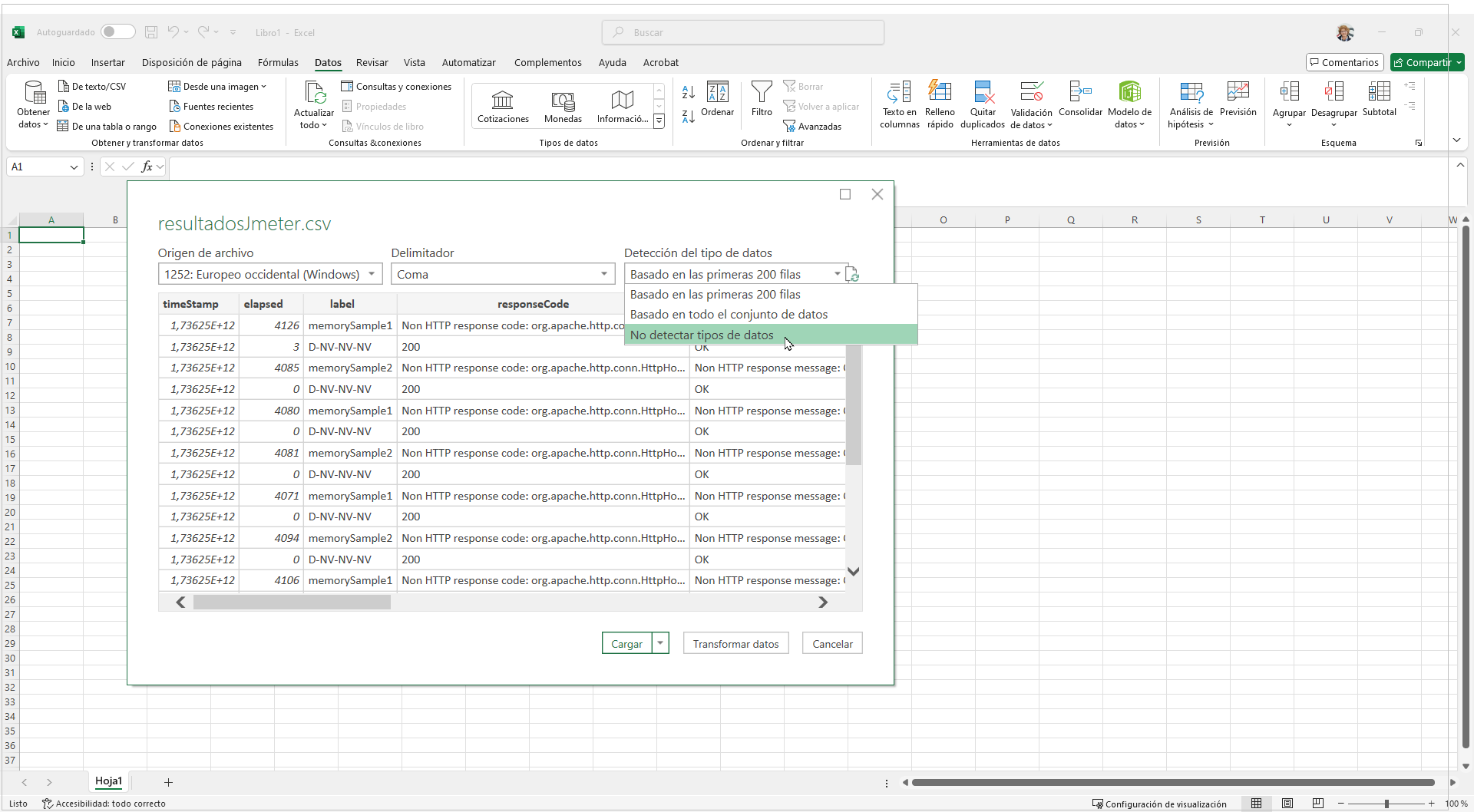 Al importar los datos, nos pide el tipo de datos, marcamos No detectar tipos de datos: