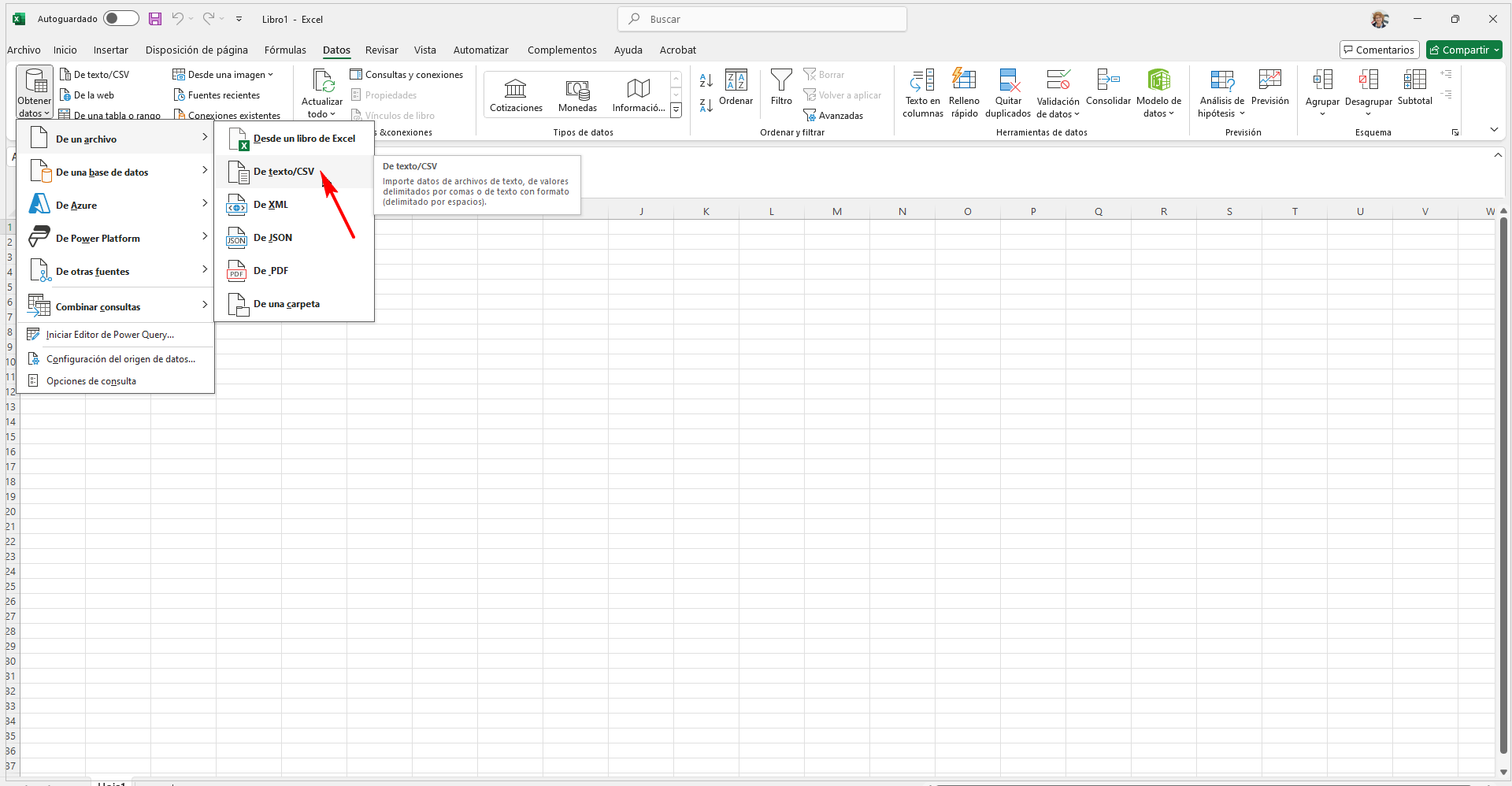 Para ver el fichero .csv de resultados, abrimos el programa excel con un libro en blanco y marcamos la pestaña "Datos", luego "Obtener datos" y por último "de fichero CSV":