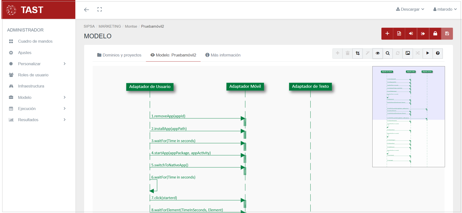 La funcionalidad del Adaptador Móvil es usar e interactuar con dispositivos Android, incluyendo ambos emuladores como dispositivos físicos. La configuración necesaria se encuentra en el apartado Guía para Adaptador Móvil de TAST.