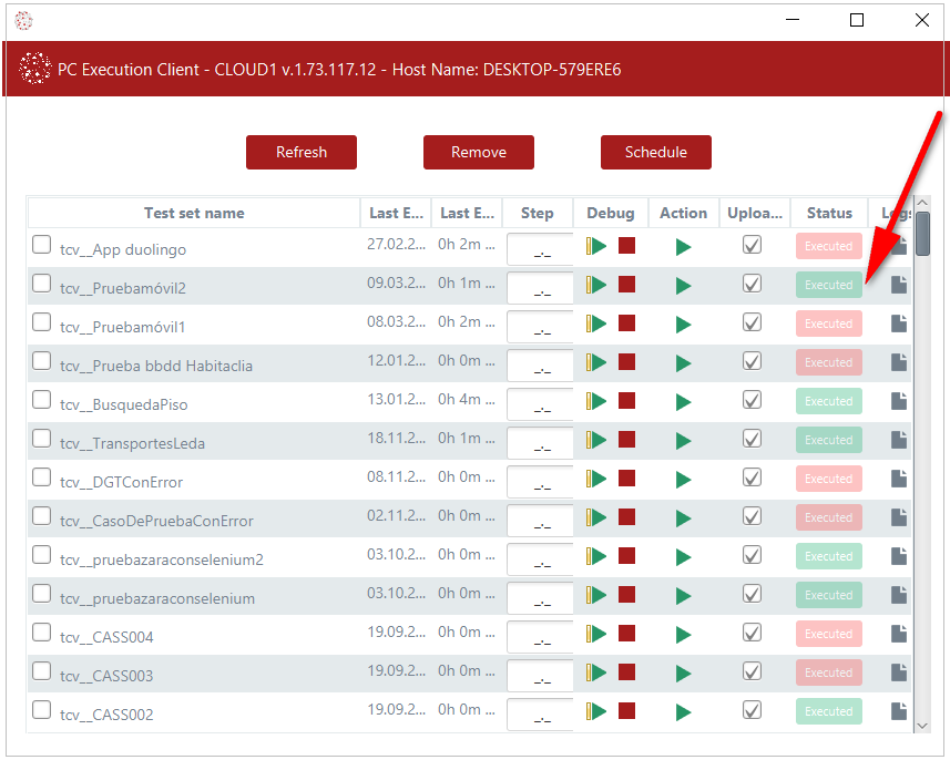 Al abrir el cliente de TAST, lanzamos la ejecución y vamos comprobando que se realiza correctamente. Una vez ejecutado queda registrado que se ha ejecutado con éxito, ya que aparece marcada en verde la casilla de Status.