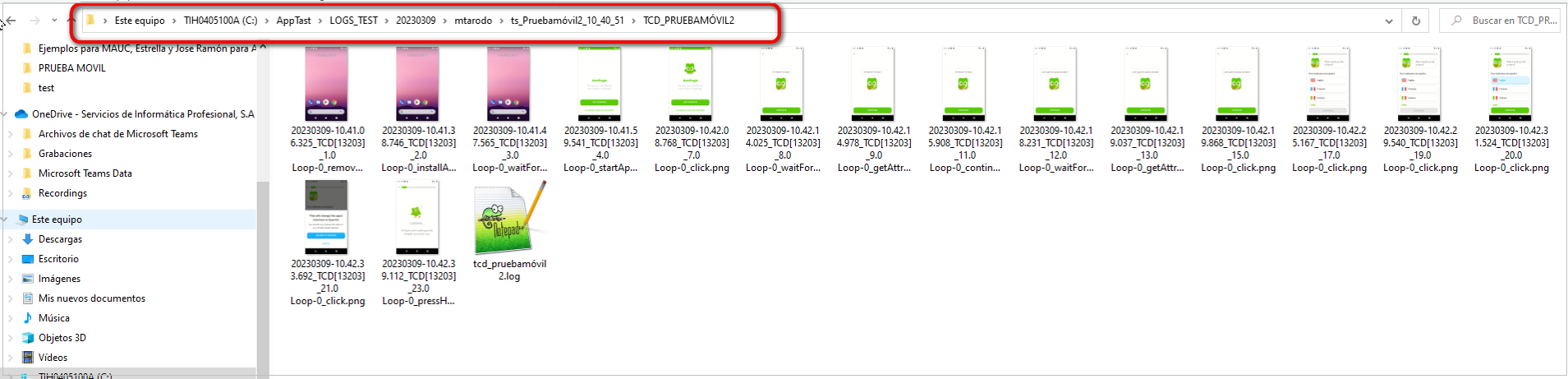 Al terminar de ejecutar este caso de prueba, tenemos como resultado la carpeta de evidencias, donde se almacena tanto el log de la ejecución, como los ficheros que se hayan podido generar así como las capturas de pantallas de la ejecución, si hemos marcado en Validación la casilla de obtener evidencias en las Propiedades del diagrama.