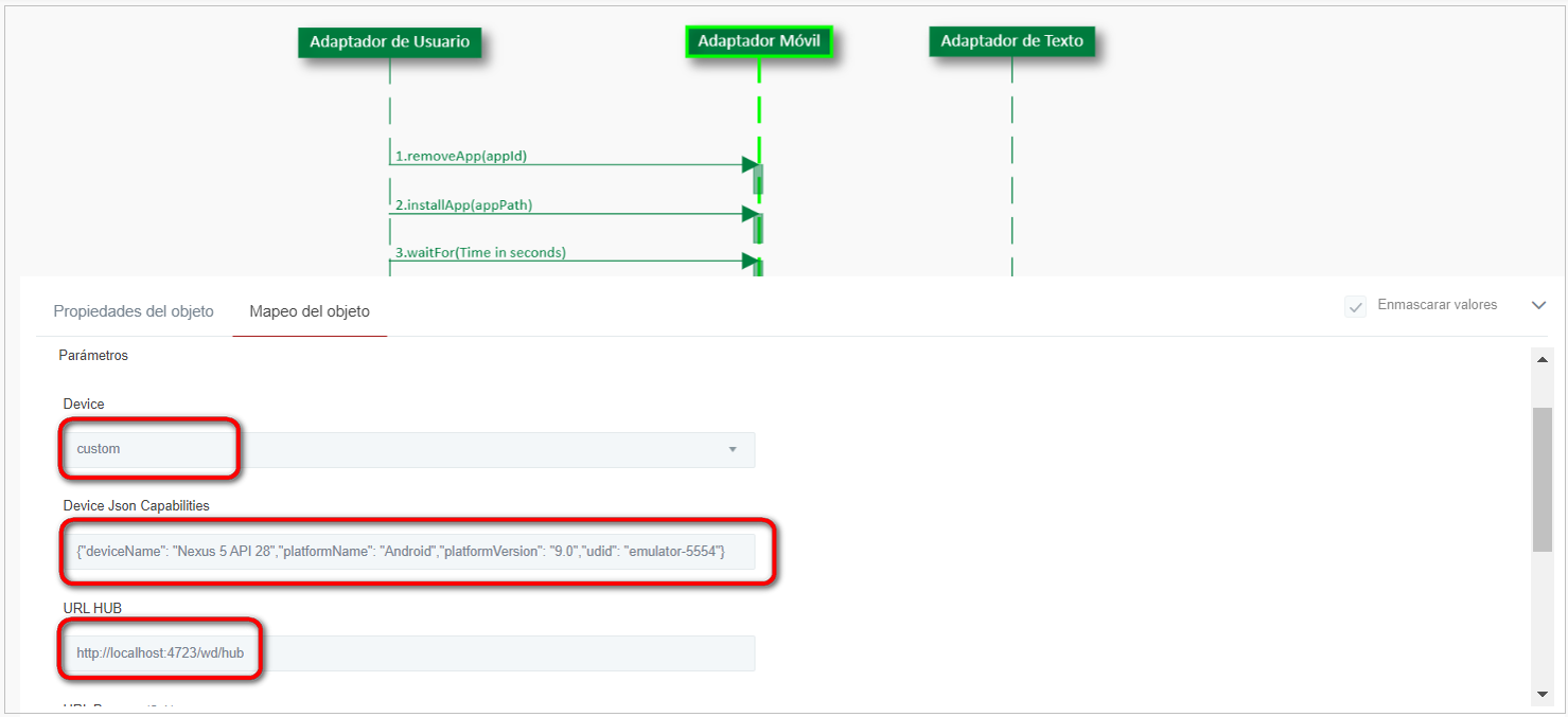 En la casilla de Device Json Capabilities, hay que poner las mismas que hemos que hemos puesto al configurar Appium.