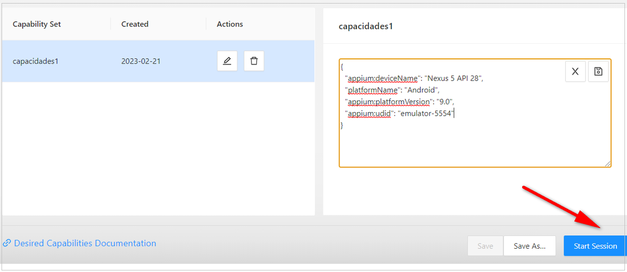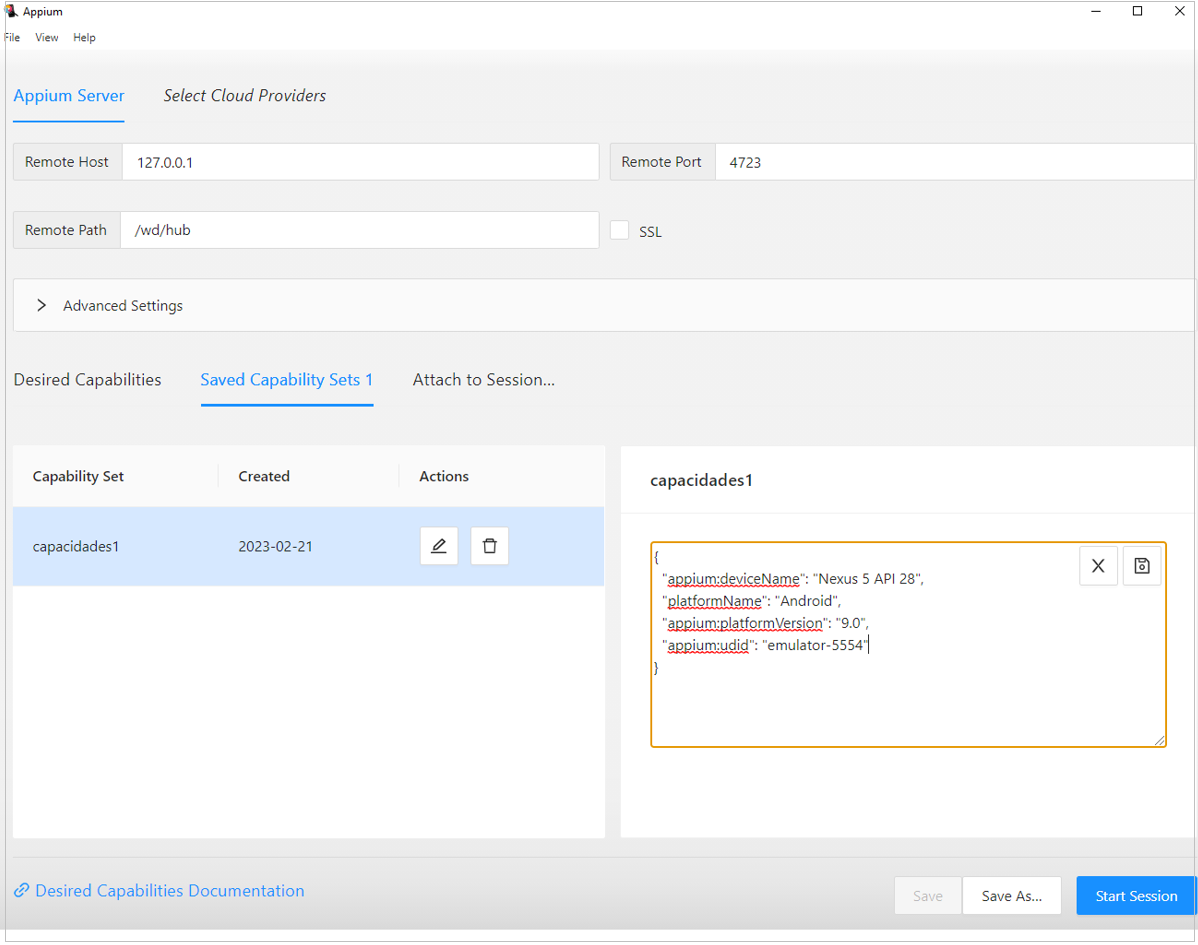 Veremos una primera casilla “Desired capabilities” y marcaremos la segunda “Saved Capability Sets 1”. En la pantalla “JSON Representation” registraremos los datos necesarios, siguiendo esta estructura: