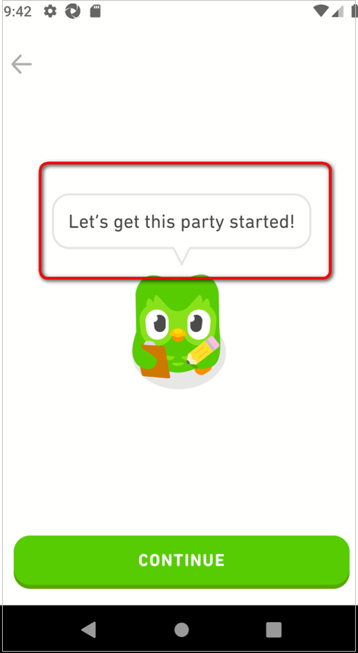 Una vez instalada la app de Duolingo, nos dará la bienvenida e interactuaremos como si fuera nuestro propio móvil. Veremos la pantalla de presentación e iremos aceptando, contestando y eligiendo las opciones que nos presenta. También recogeremos el texto de algunas pantallas y lo escribiremos en un fichero de texto que hemos creado para tal fin.