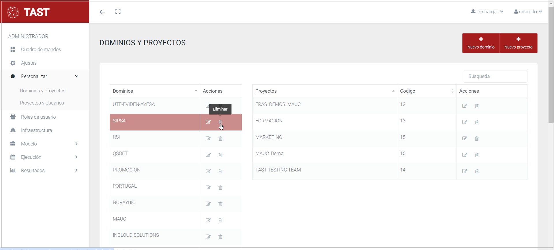 Esta opción de la herramienta TAST permite al administrador borrar un dominio.