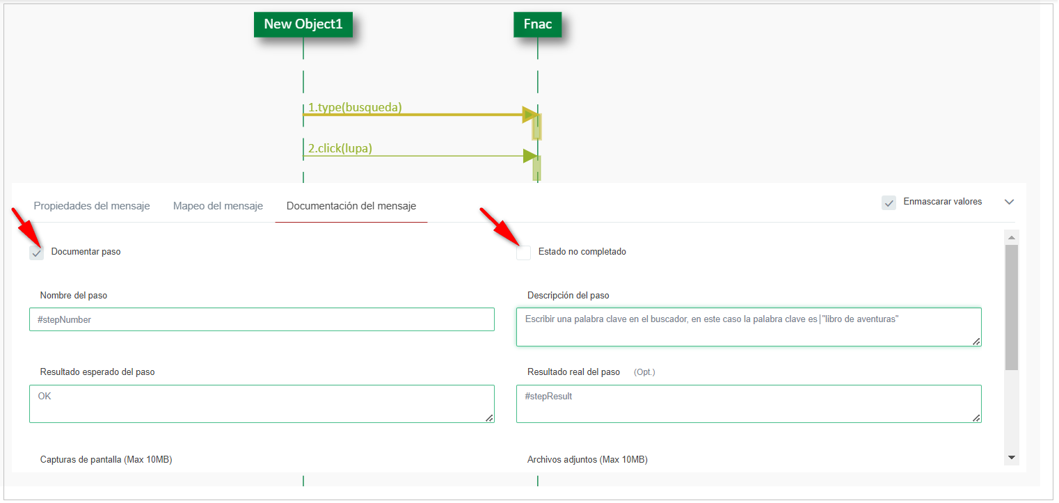 El “estado no completado” es un checkbox que ha sido añadido en la documentación del mensaje. Este checkbox solo puede ser seleccionado si el checkbox de “documentar paso” está activado. Si el nuevo checkbox está activado, indica si el estado de la ejecución está completado o no.