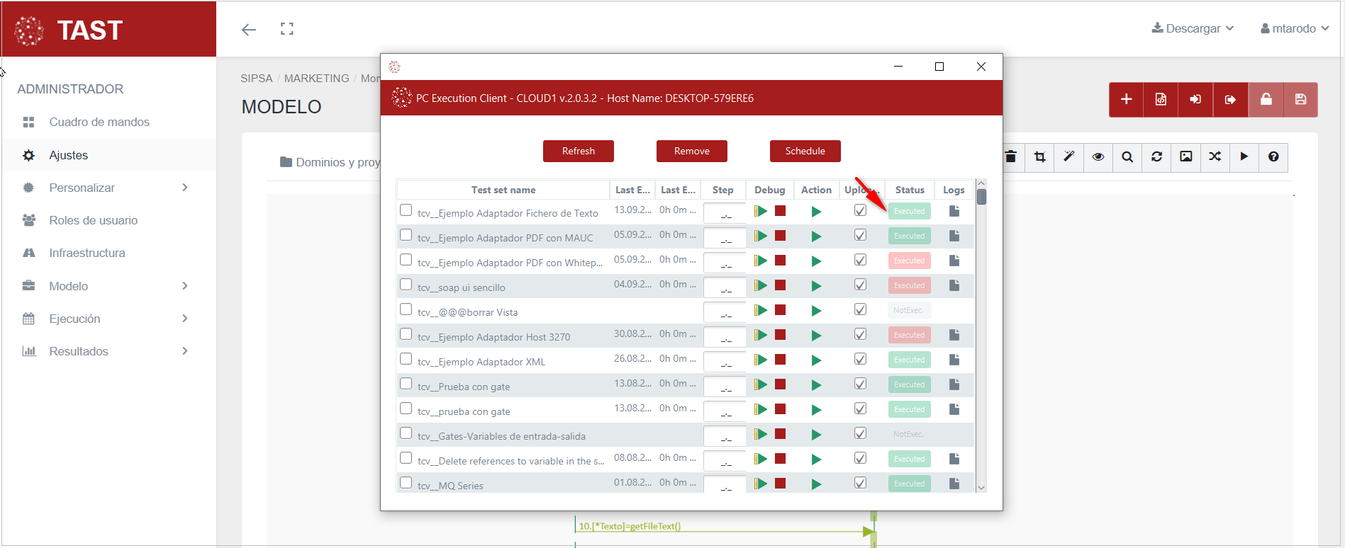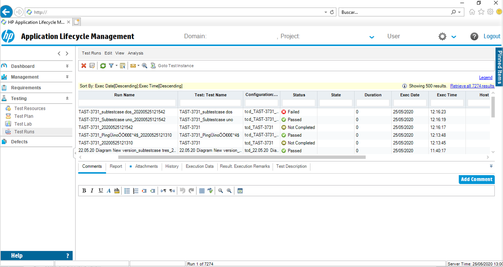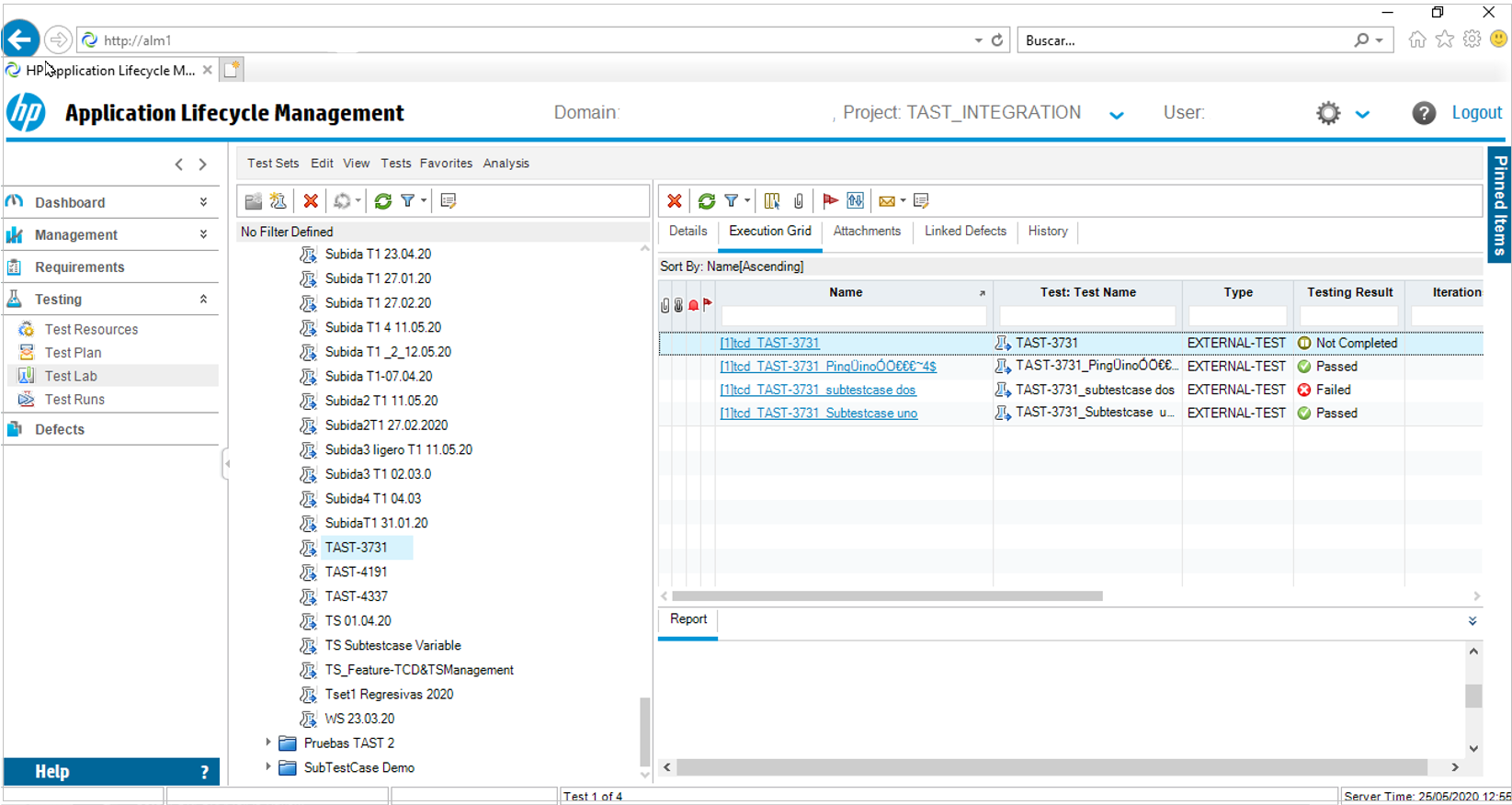 La ejecución principal en ALM tendrá un nombre similar a Gestión de TS con un icono negro y el nombre Not Completed como en las siguientes imágenes: