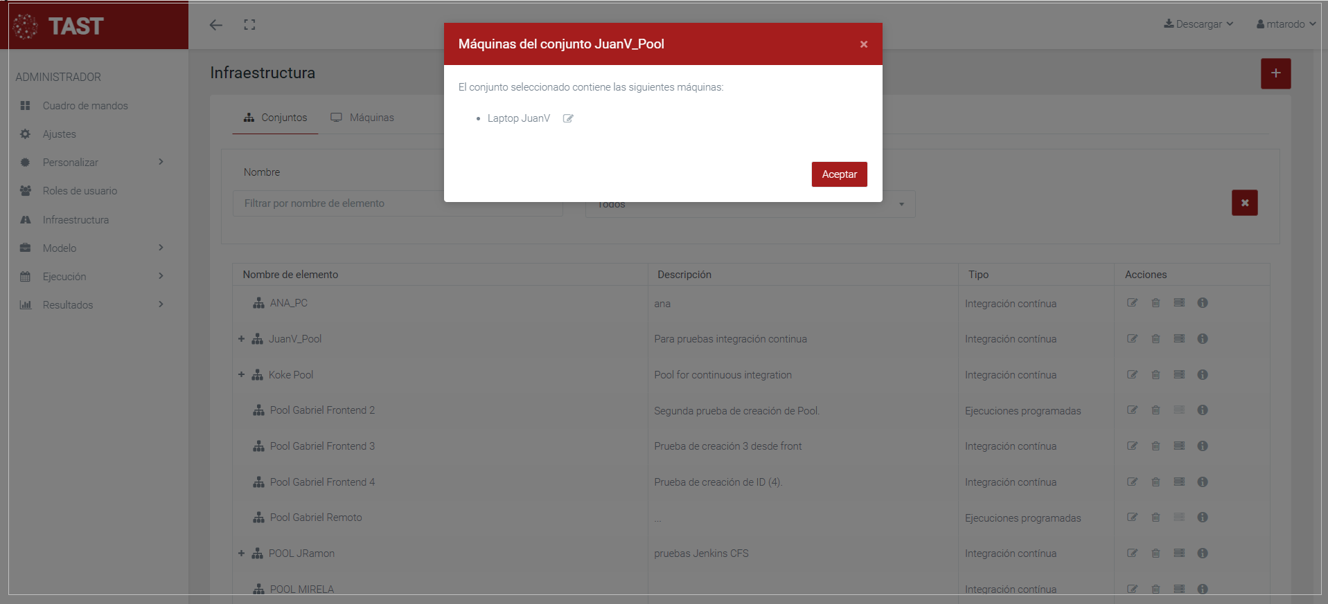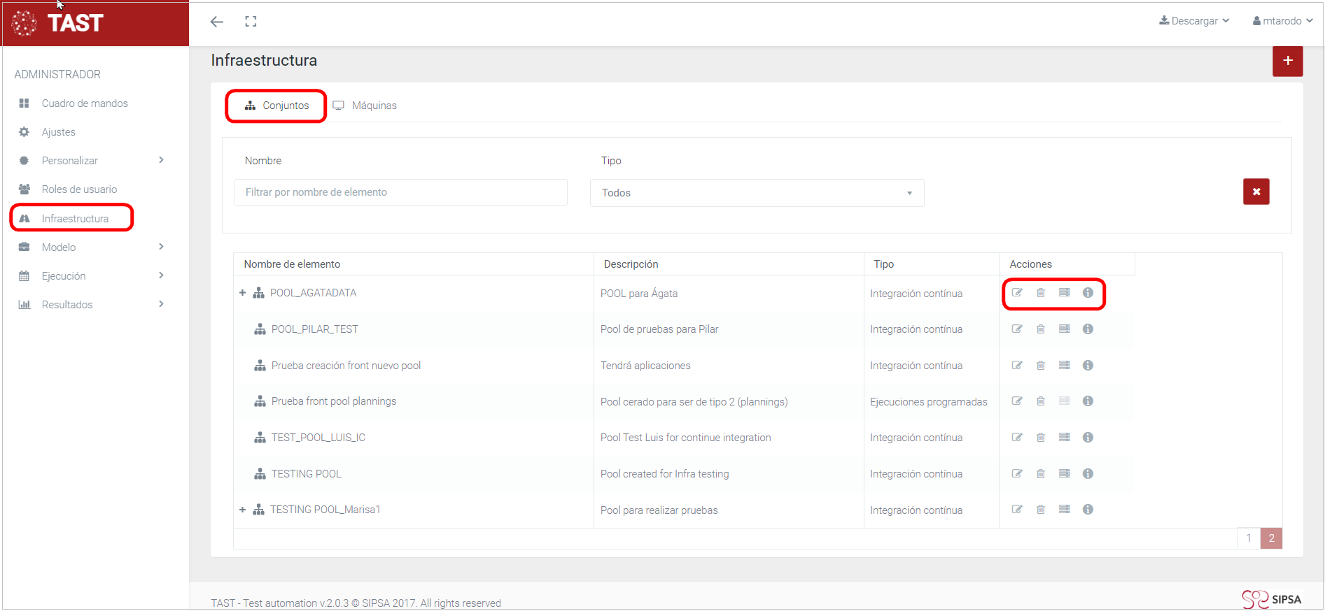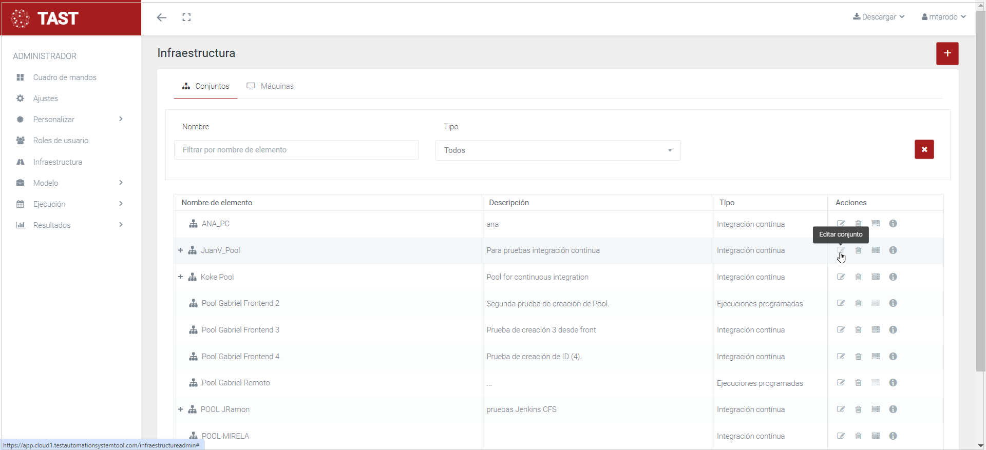 Por defecto esta es la primera pantalla que verá al hacer clic en “Infraestructura”. Muestra una lista de todos los Pools existentes, junto con una descripción, Type (Integración continua/Ejecuciones planificadas) y un conjunto de acciones. Esta lista se puede filtrar mediante el campo “Nombre” o la lista desplegable Tipo; ambos se colocan encima de la lista.
