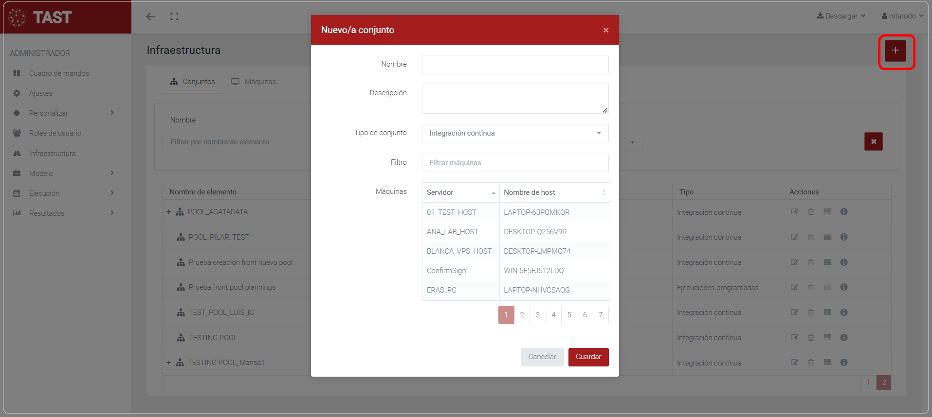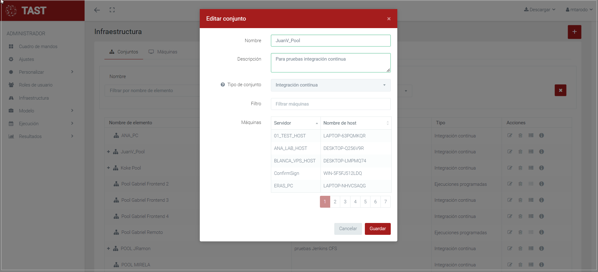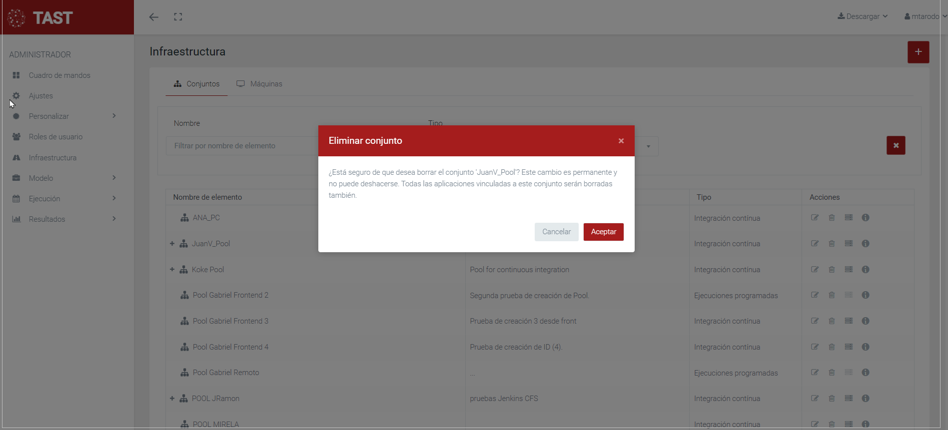 Por defecto esta es la primera pantalla que verá al hacer clic en “Infraestructura”. Muestra una lista de todos los Pools existentes, junto con una descripción, Type (Integración continua/Ejecuciones planificadas) y un conjunto de acciones. Esta lista se puede filtrar mediante el campo “Nombre” o la lista desplegable Tipo; ambos se colocan encima de la lista.