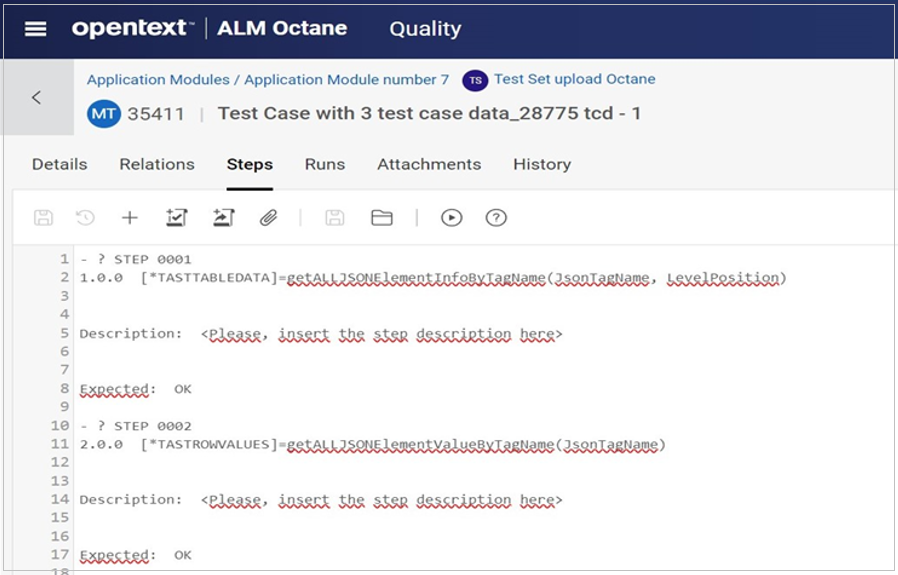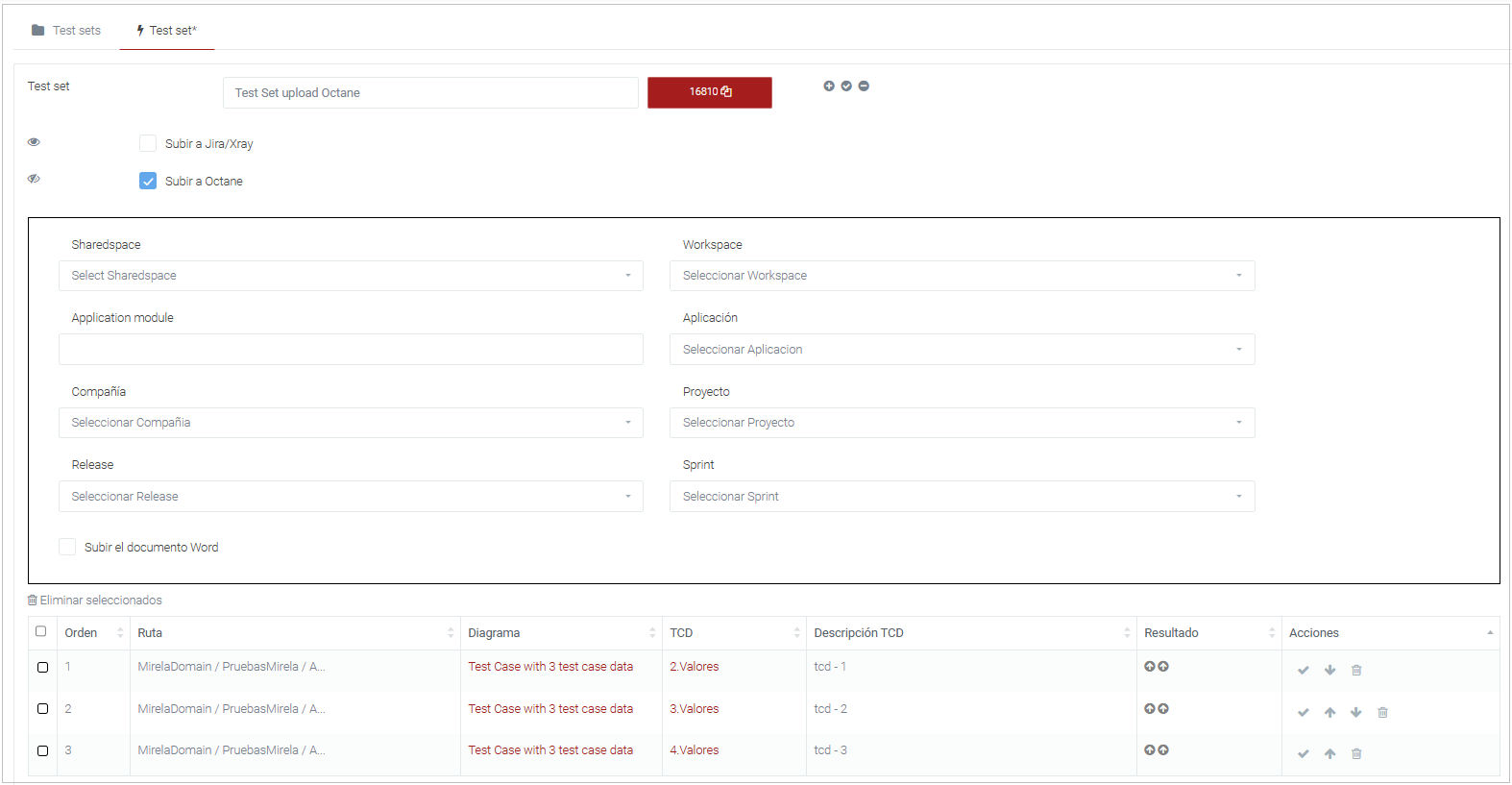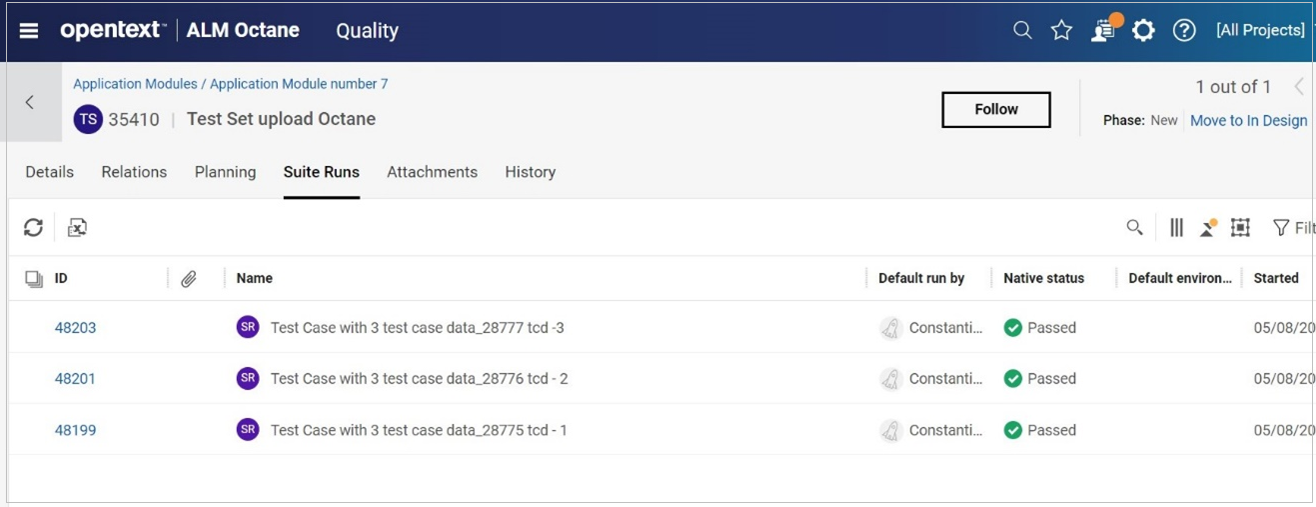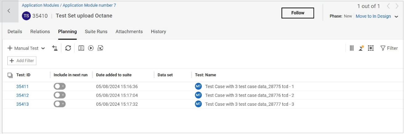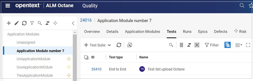 Un Test Set será el equivalente al Test Suite en ALM-Octane y un Test Case Data será un Test Manual. Cada vez que ejecutemos un mismo Test Case Data, al cargarlo dentro del mismo Test Manual, se almacenarán las Ejecuciones Manuales, que serían sus ejecuciones.