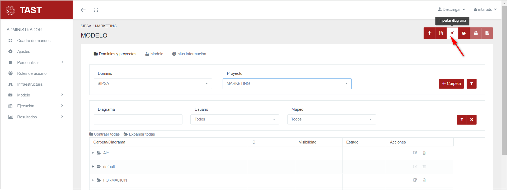 Si el usuario elige importar un caso de prueba ya creado, pulsará el botón de “Importar” que está cerca del botón de “Nuevo diagrama”.
