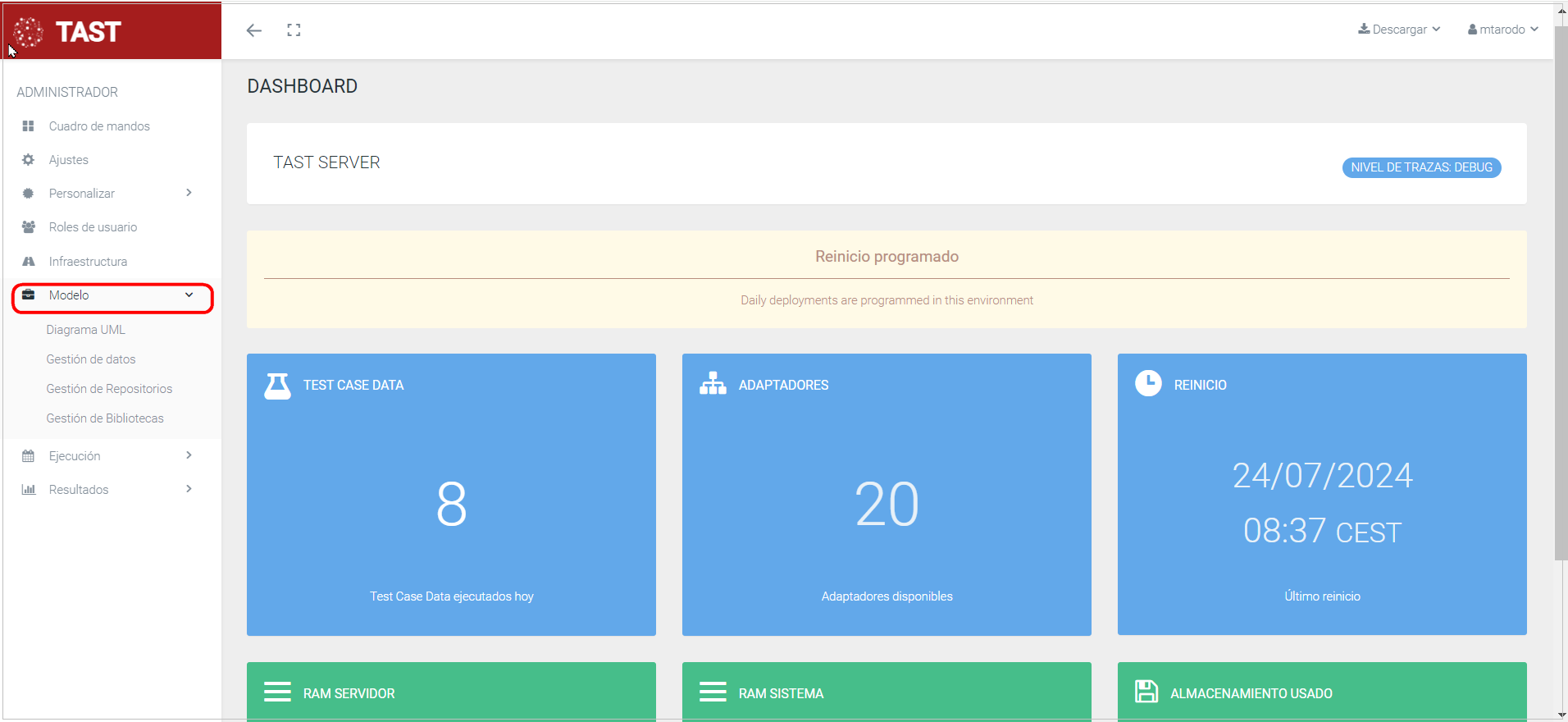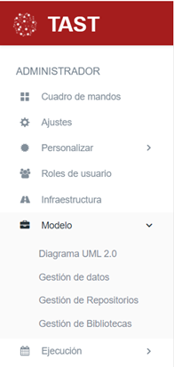 Cuando haya iniciado sesión en la herramienta, el usuario puede ver un menú en el lado izquierdo (consulte Primeros pasos en TAST para obtener más información). En este menú, el usuario hará clic en el botón “Modelado”.