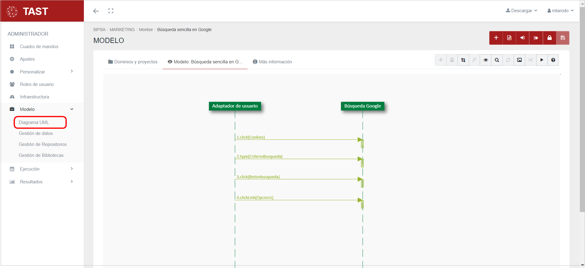 Esta opción de la herramienta TAST permite al usuario administrar diagramas UML. También podrá gestionar los datos y gestionar los repositorios de los casos de prueba que se diseñen y gestionar todos los tratamientos asociados con los diagramas UML.