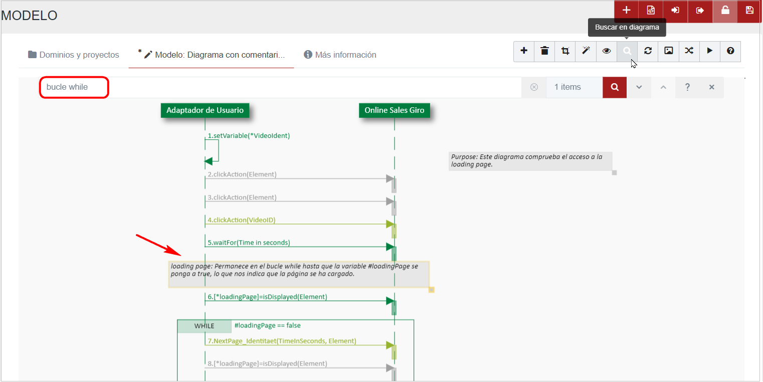 Lupa: permite realizar búsquedas de texto libre en todos los elementos del diagrama, y también permite acotar las búsquedas sobre aquellos elementos que nos interesen en un momento dado.