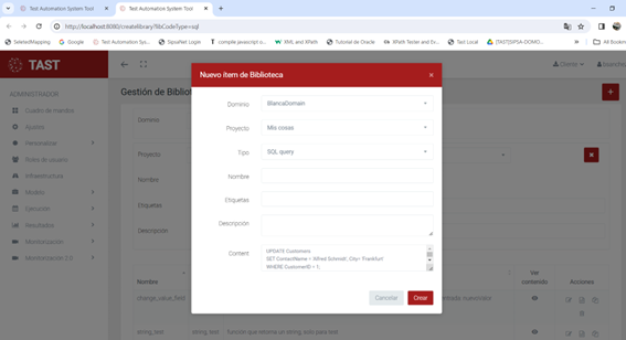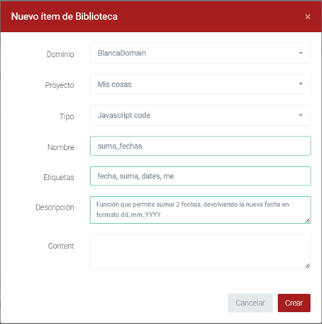 Pulsando el botón “Nuevo ítem de biblioteca” desde la ventana de edición de código Javascript/Sql de Modelado, que automáticamente lanzará la página Gestión de Bibliotecas en una nueva pestaña de su navegador, y con el formulario de Crear un nuevo ítem de biblioteca abierto y con los campos Dominio, Proyecto, Tipo y Contenido ya rellenos.