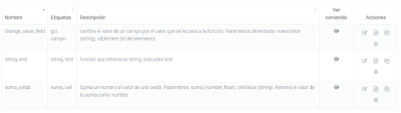 - Las Columnas Nombre, Etiquetas y Descripción muestran los respectivos campos y pueden ser ordenables alfabéticamente.