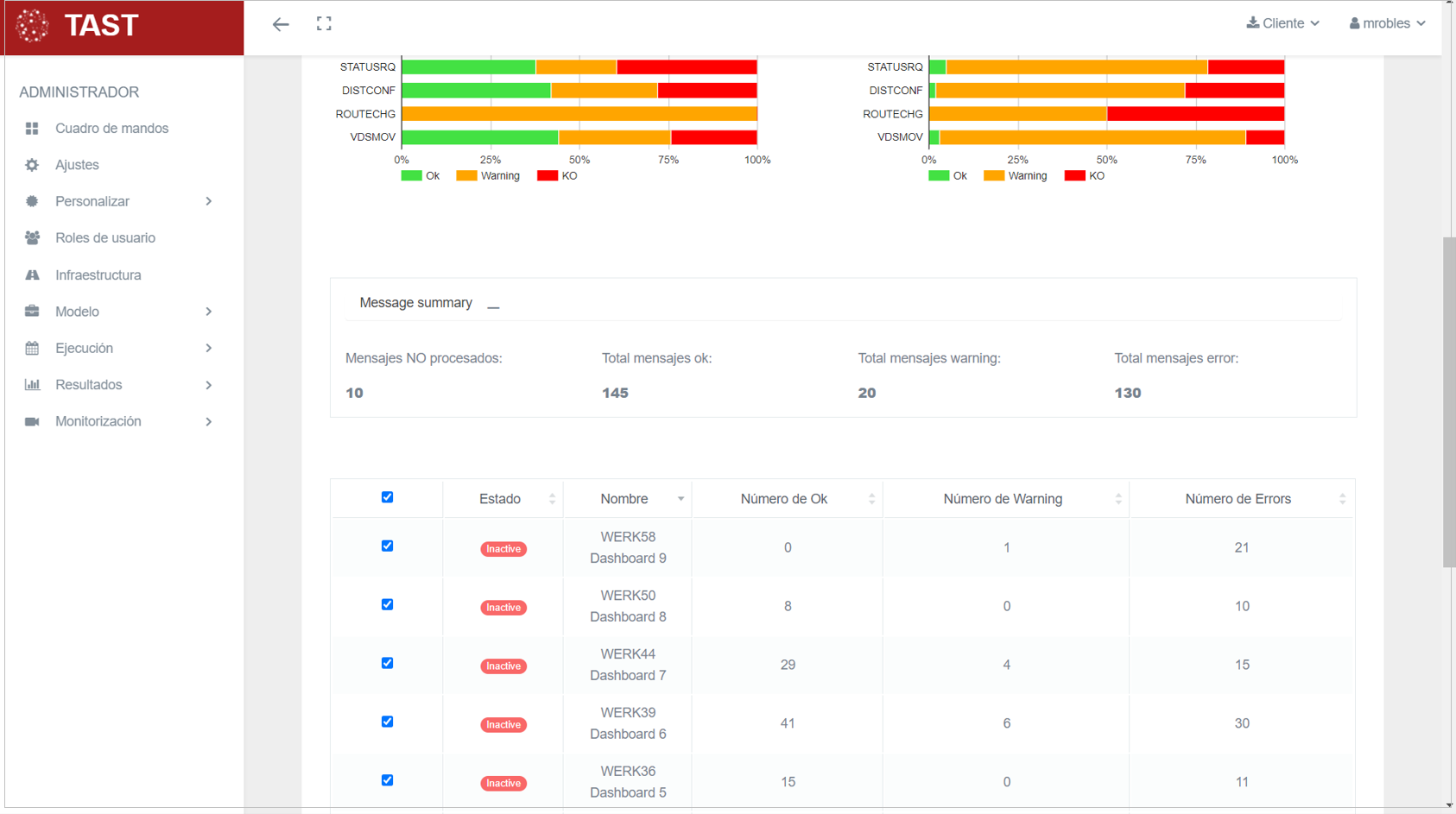 Debajo de los gráficos hay una caja que contiene el número total de mensajes no procesados, mensajes Ok, mensajes con aviso de validación y mensajes con error de validación. Estos valores dependen de los sistemas seleccionados.