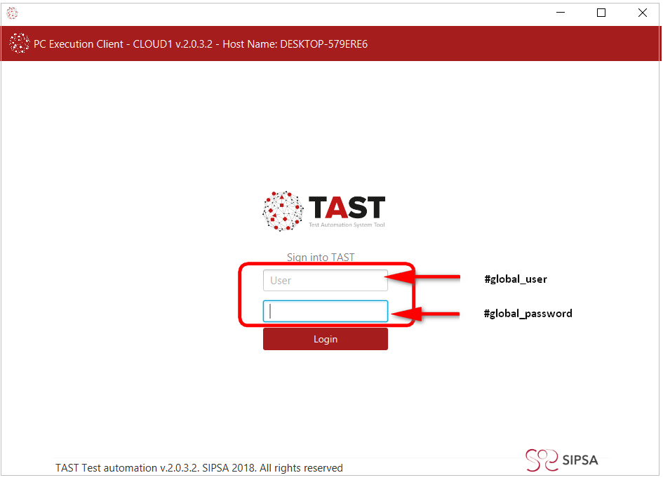 Podemos obtener variables globales para usar en los diagramas; estas variables globales son: #global_user y #global_password. Estas variables globales se obtienen directamente del cliente de TAST, por lo que cada usuario, utilizando estas variables, estará utilizando el usuario y contraseña con el que entró al cliente de TAST. Es importante recordar que es responsabilidad del usuario, que su contraseña pueda verse en alguna captura de pantalla.