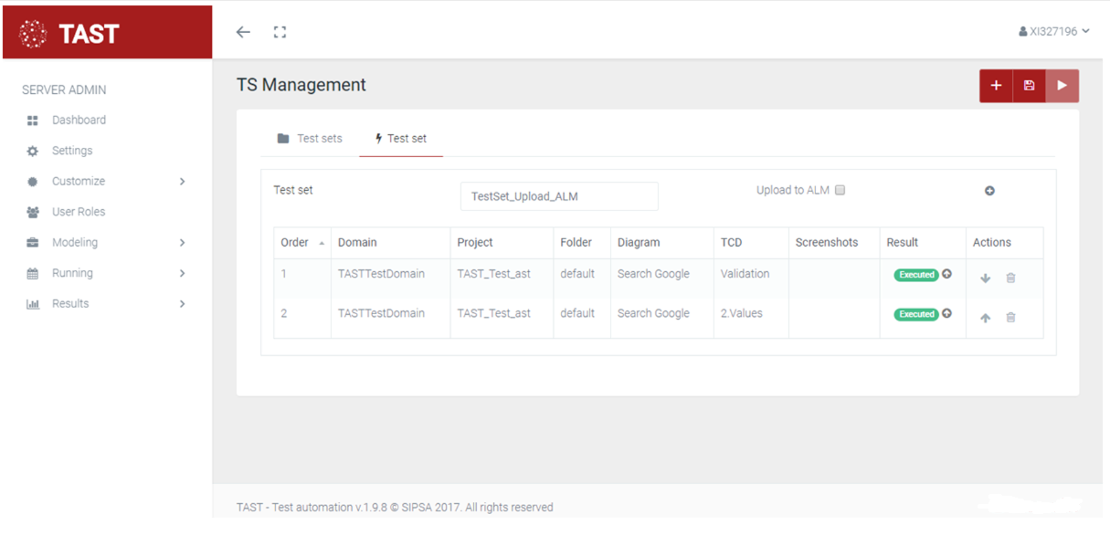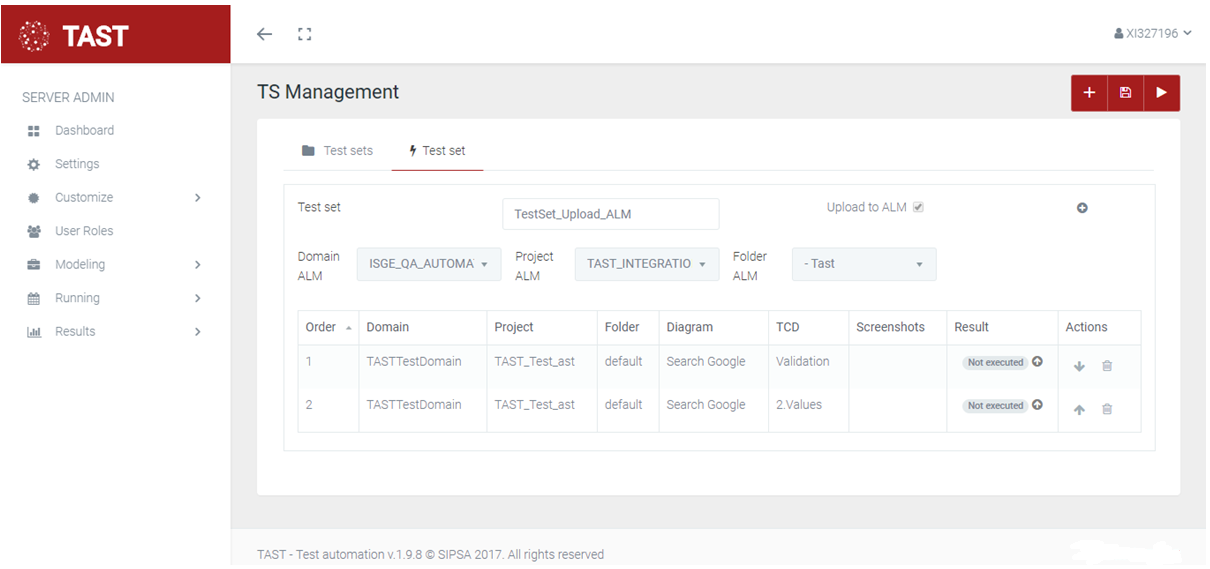 ALM integration is linked with the TAST test set. Once ALM integration is configured via application properties file, TAST will check ALM availability while loading the page TS Management. If the check is OK, the user will be able to configure the ALM domain, project and folder, where TAST will upload results and evidences, during the process of creation/edition of Test Sets.