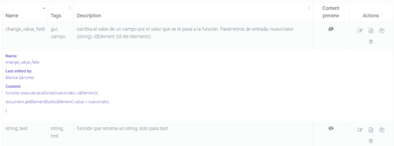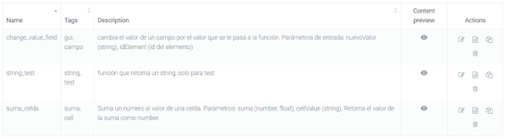 Clicking on the Edit content button in the Actions column takes you directly to the code editor, where the user can modify the javascript or sql code of the item and save it again. This action also checks that no other user is editing the content of the item at the same time.