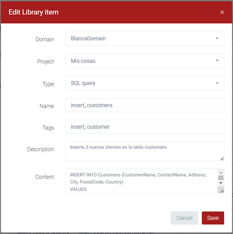 Clicking the Create new library item button from the Modeling Javascript/Sql code editing window, which will automatically launch the Library Management page in a new tab of your browser, with the Create new library item form open and with the Domain, Project, Type and Content fields already filled in.