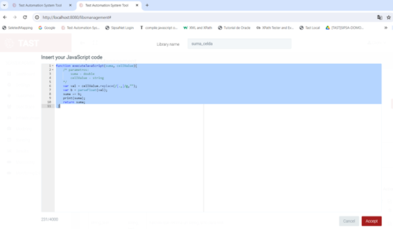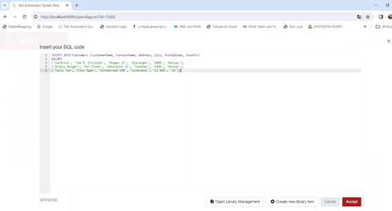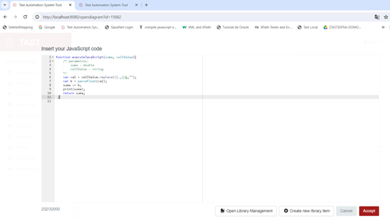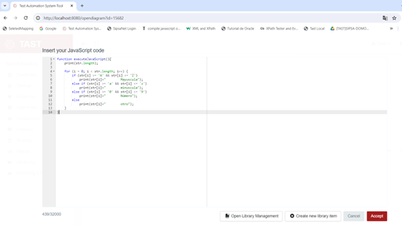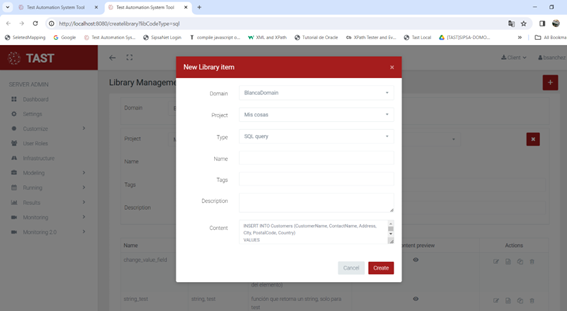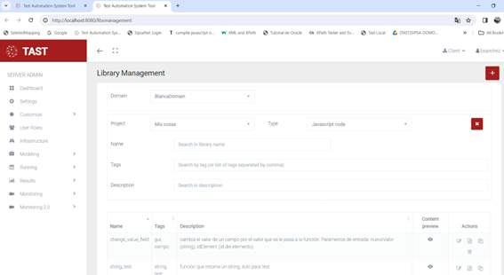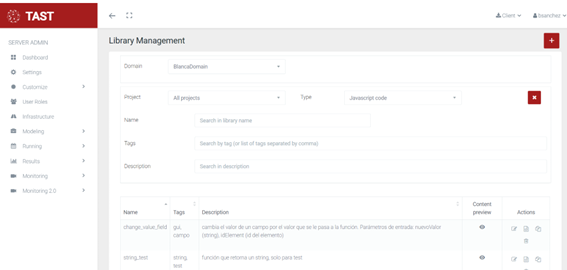 Library Management provides TAST, and specifically the diagram modeling part, with a library management tool to store, organize and query javascript functions or Sql queries, that the user considers useful, for example to be reused in the messages of other diagrams.