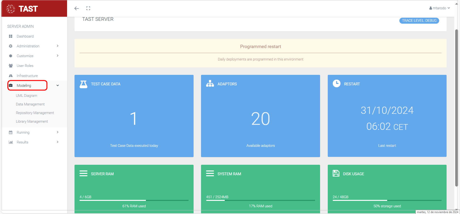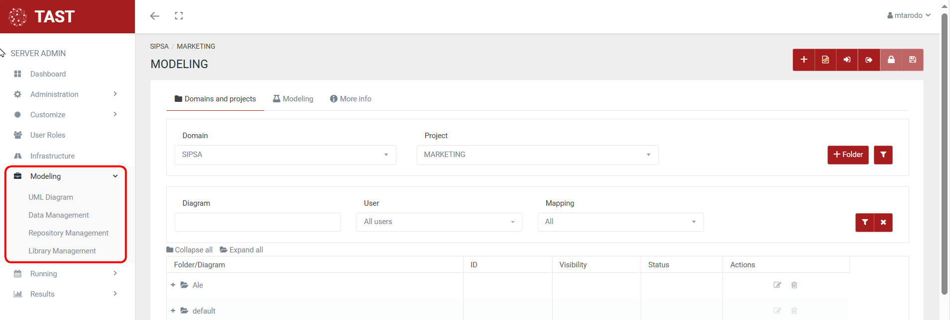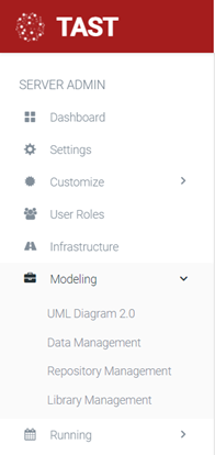 When logged in the tool, the user can see a menu in the left side (see First steps in TAST for further info). In this menu, the user will click on the button “Modeling”.
