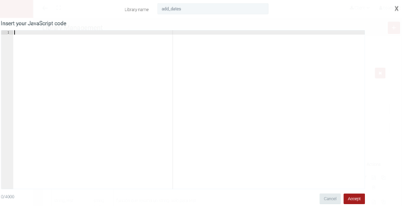 By clicking on this field, it expands and takes us to a modal window with the special code editor for entering Javascript or Sql code.