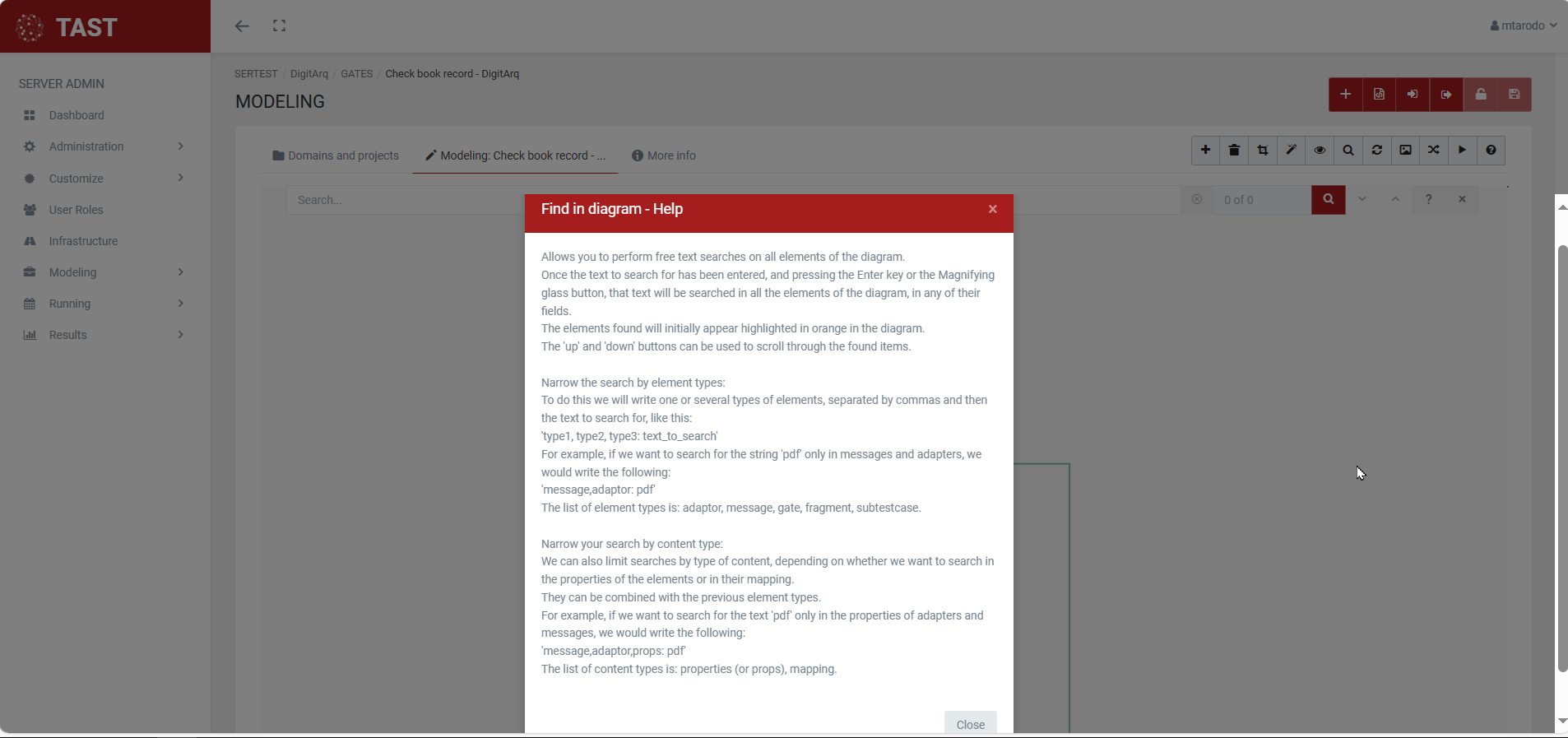 It allows you to carry out free text searches in all the elements of the diagram, and it also allows you to limit the searches on those elements that interest you at a given moment.