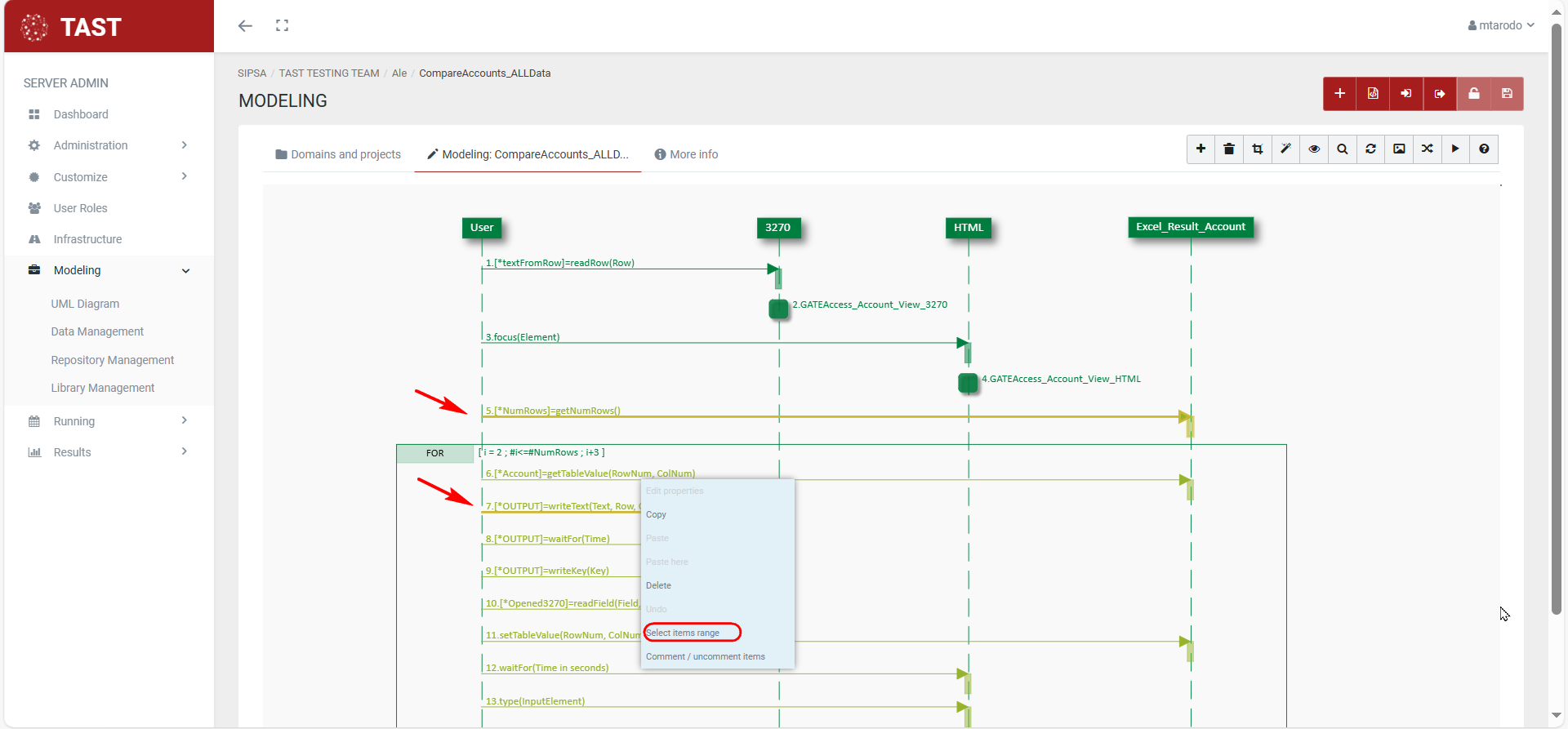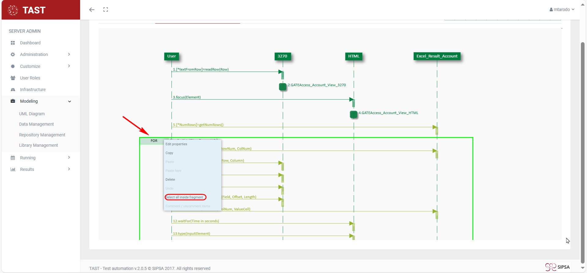 Select all items in fragment: If the selected object is a fragment or subtestcase, it allows selection of all the objects that are within it.